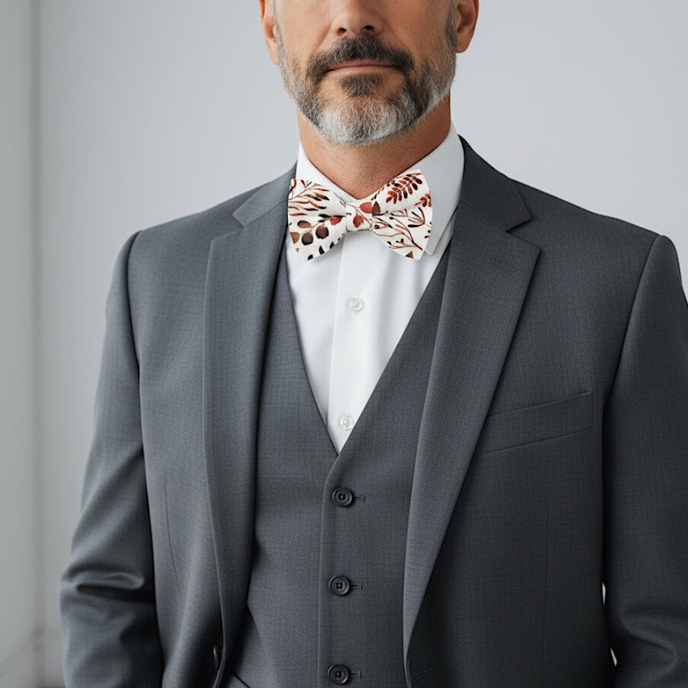 Warm, seasonal, and stylish, this Terracotta Autumn Floral Bow Tie brings cozy fall charm to any wedding or formal occasion.
