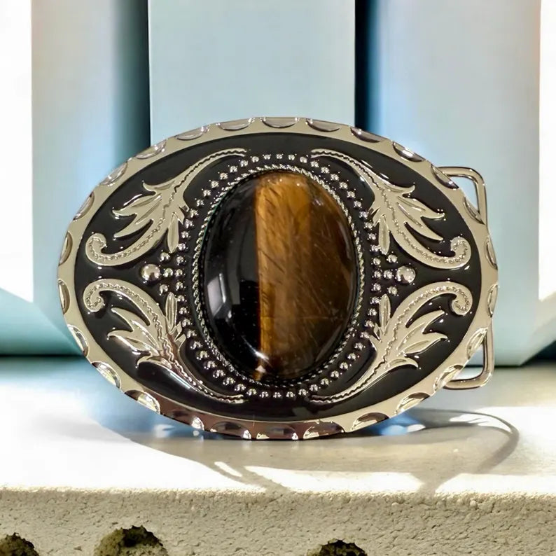 Brown Tiger’s Eye belt buckle for cowboys, Western outfits, rodeo season, country concerts, ranch wear, and Southwestern style. This Western Brown Tiger’s Eye belt buckle is a striking statement accessory designed for men and women who appreciate Western fashion, classic cowboy style, and rugged country spirit. Featuring a polished brown Tiger’s Eye stone centerpiece with rich golden-brown tones, framed by engraved Western metalwork, this buckle delivers timeless cowboy appeal with a warm, natural edge.