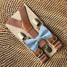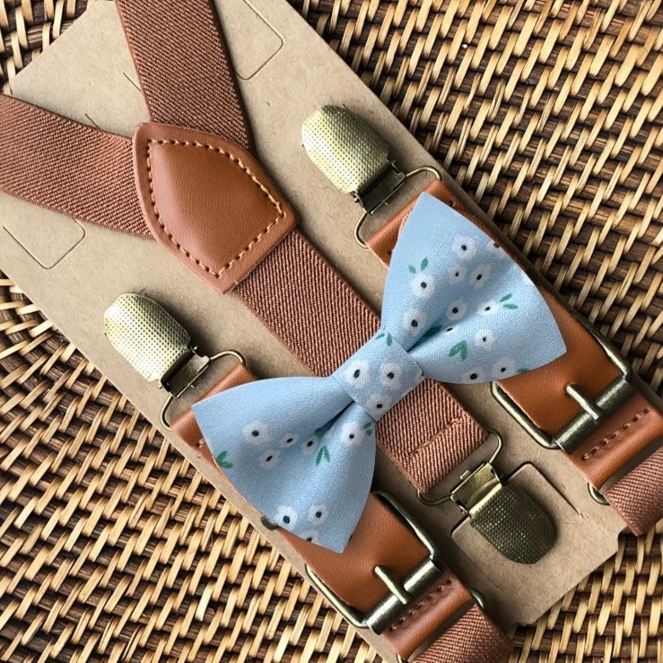Dusty Blue Floral Bow Tie & Brown Suspenders Set