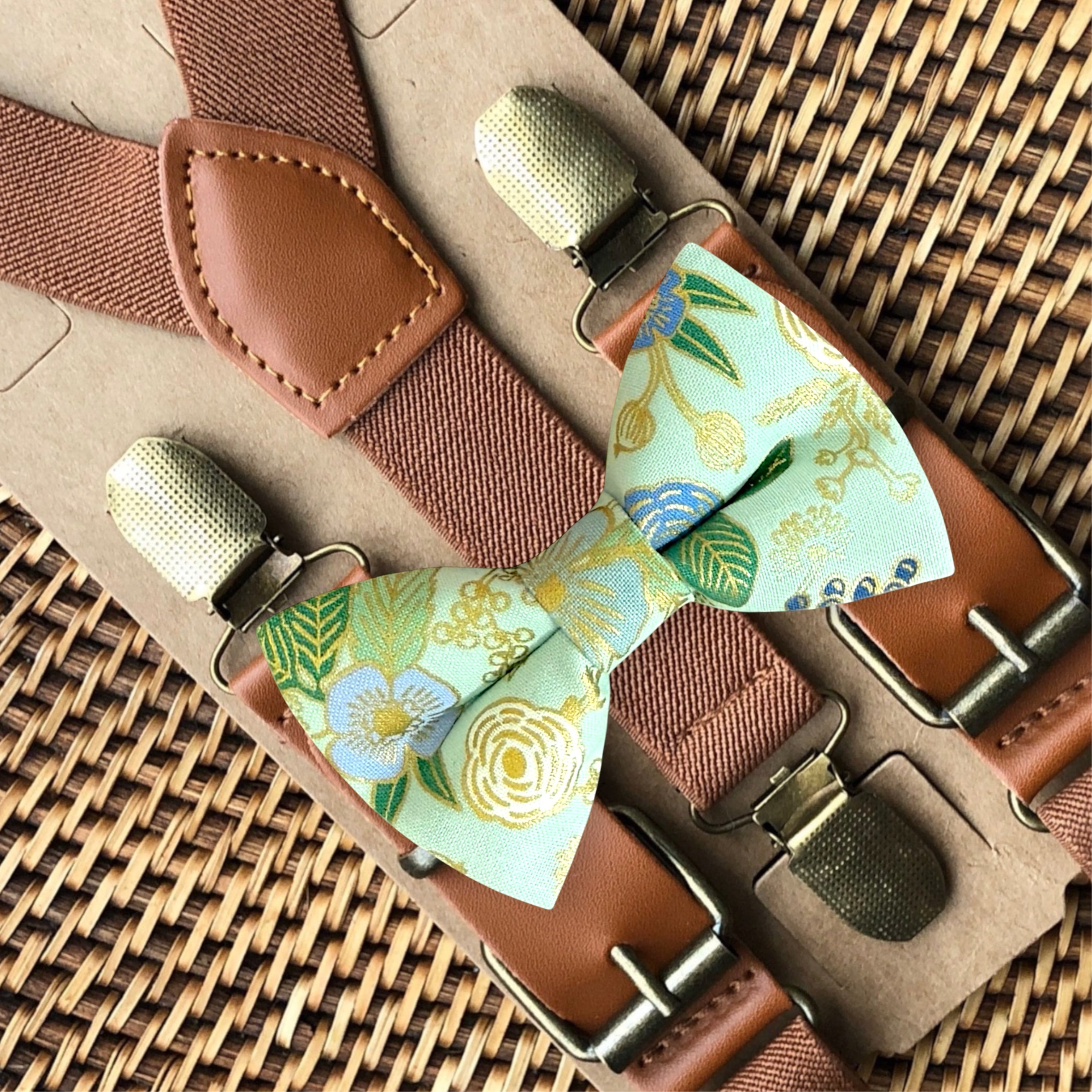 This green floral bow tie & brown vegan leather suspender set is accented with touches of gold for a gorgeous wedding look. It is a great choice for family photos, groomsmen gift, weddings, ring bearer outfit, gift, birthday celebration or any other special occasion.