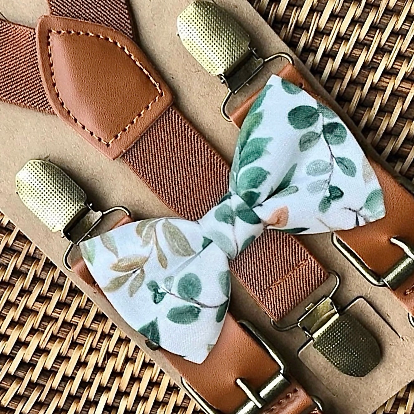 Sage & Gold Bow Tie and Cognac Buckle Suspenders Set: This floral sage bow tie & brown suspender set is a great choice for ring bearer gift, ring bearer outfit, bowtie, floral bow tie, boho wedding, green bow tie, eucalyptus wedding, or any other special occasion.