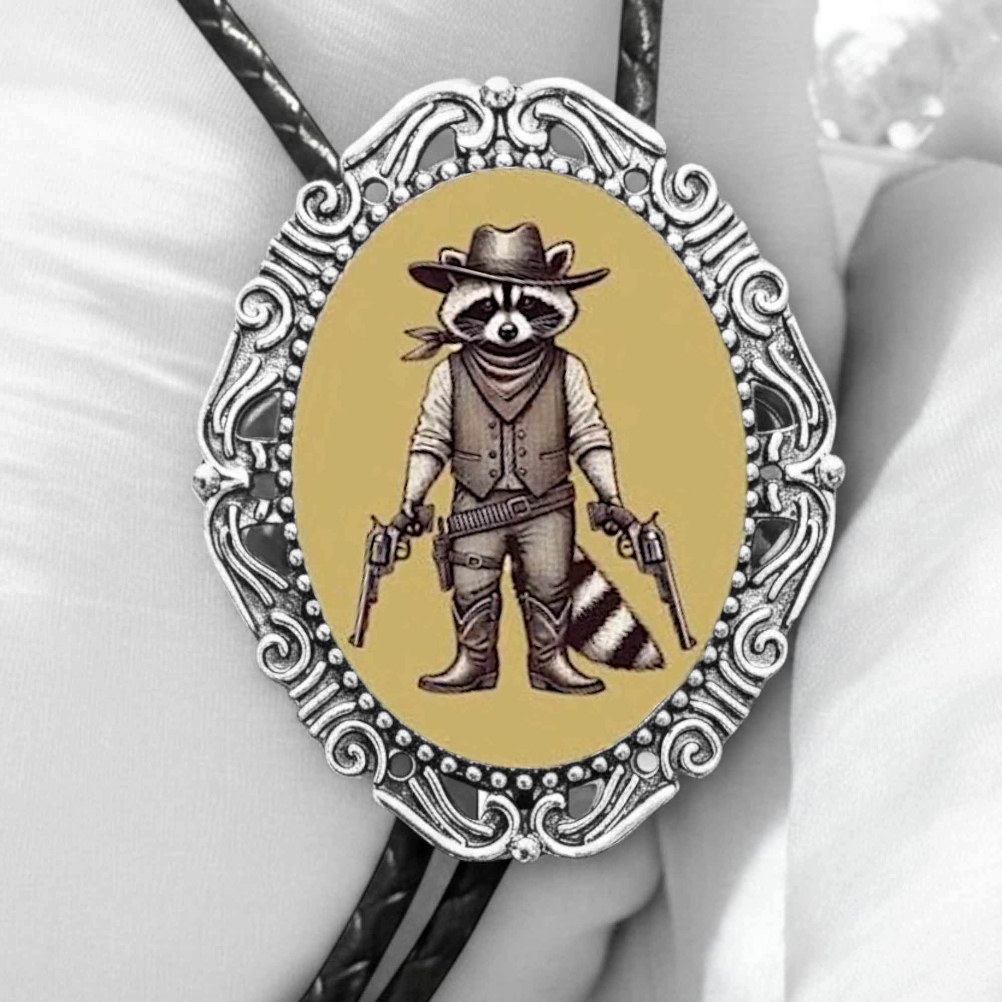 Raccoon Bolo Tie — Yellow Gun Western Bolo Tie for Rustic Weddings