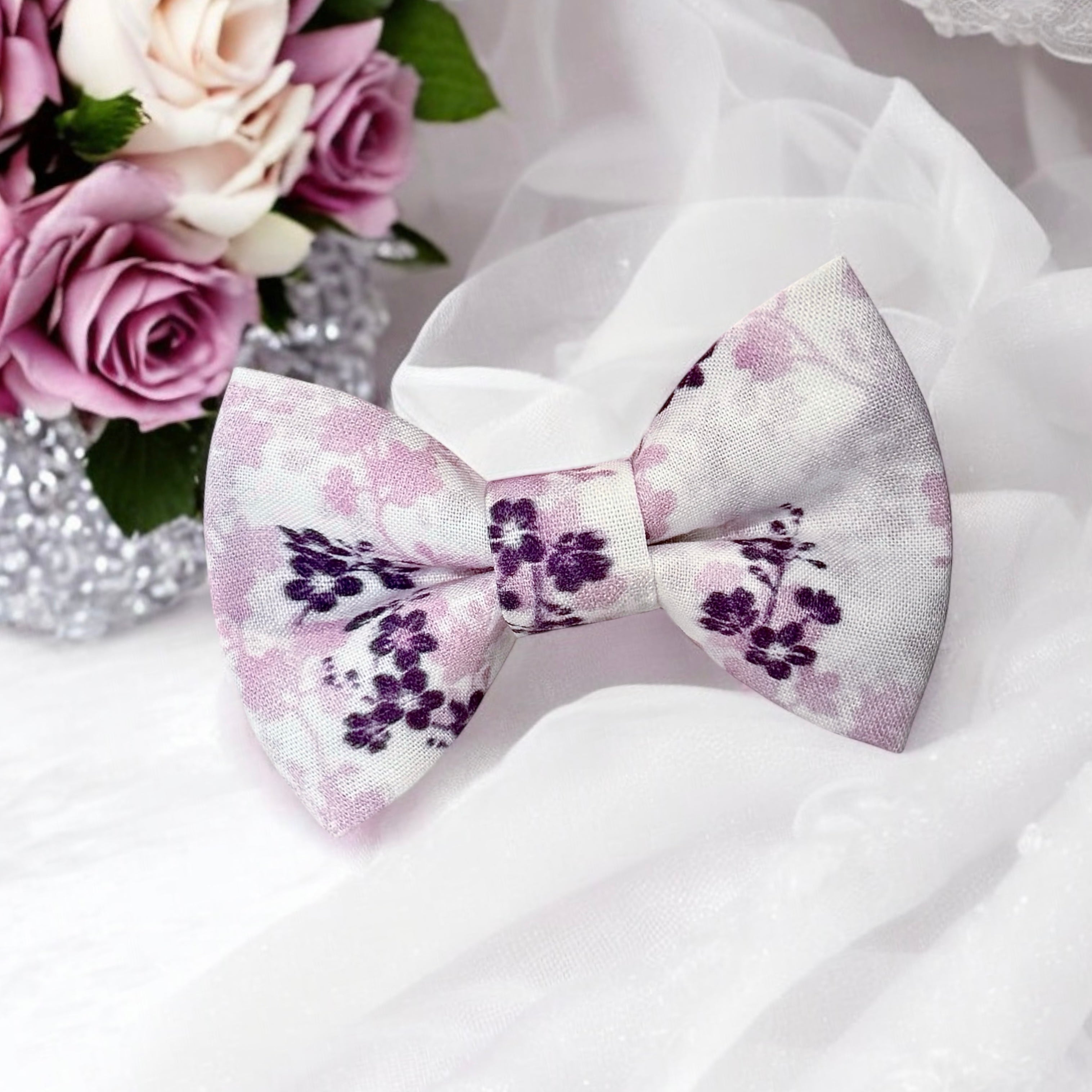 Our lavender floral bow tie is perfect for a groomsmen accessory. Purple hues can be celebrated at spring weddings, a wildflower wedding or a backyard wedding. By complementing Amethyst, plum and eggplant outfits, these bow ties will make your wedding photos unforgettable!