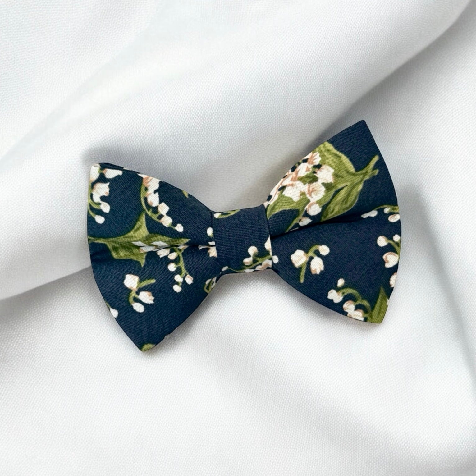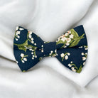 Floral Navy Bow Tie- Floral navy fabric bowtie with delicate white flowers. This special bowtie is a handmade, pre-tied accessory that adds charm to your special day. Perfect for groomsmen and ring bearers, its intricate details enhance the beauty of your wedding photos.