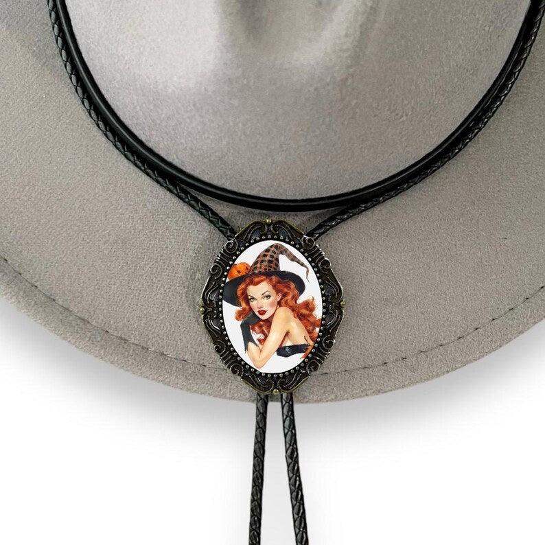 Our handmade western bolo tie features a red-headed witch with a glass coating. PERFECT for a country men’s bolo tie, wedding sting tie, necktie for groomsmen, or any special person in your life. This bolo tie for men (and women!) has a metal clamp which makes it easy to adjust.