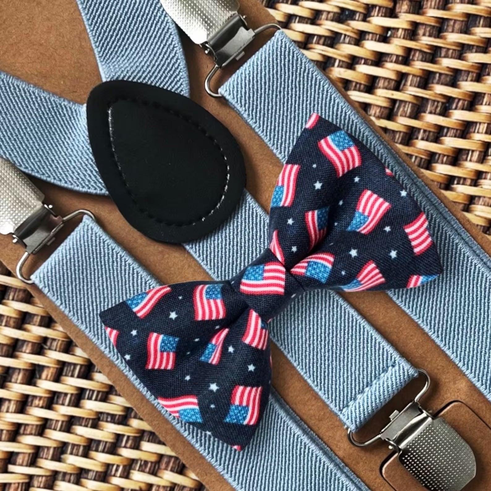 American Flag Bow Tie & Dusty Blue Suspenders Set is the PERFECT choice for toddler suspenders for toddler boy clothes, baby boy bow ties, patriotic attire, fourth of july outfit, independence day idea, and a ring bearer gift or any other special occasion.