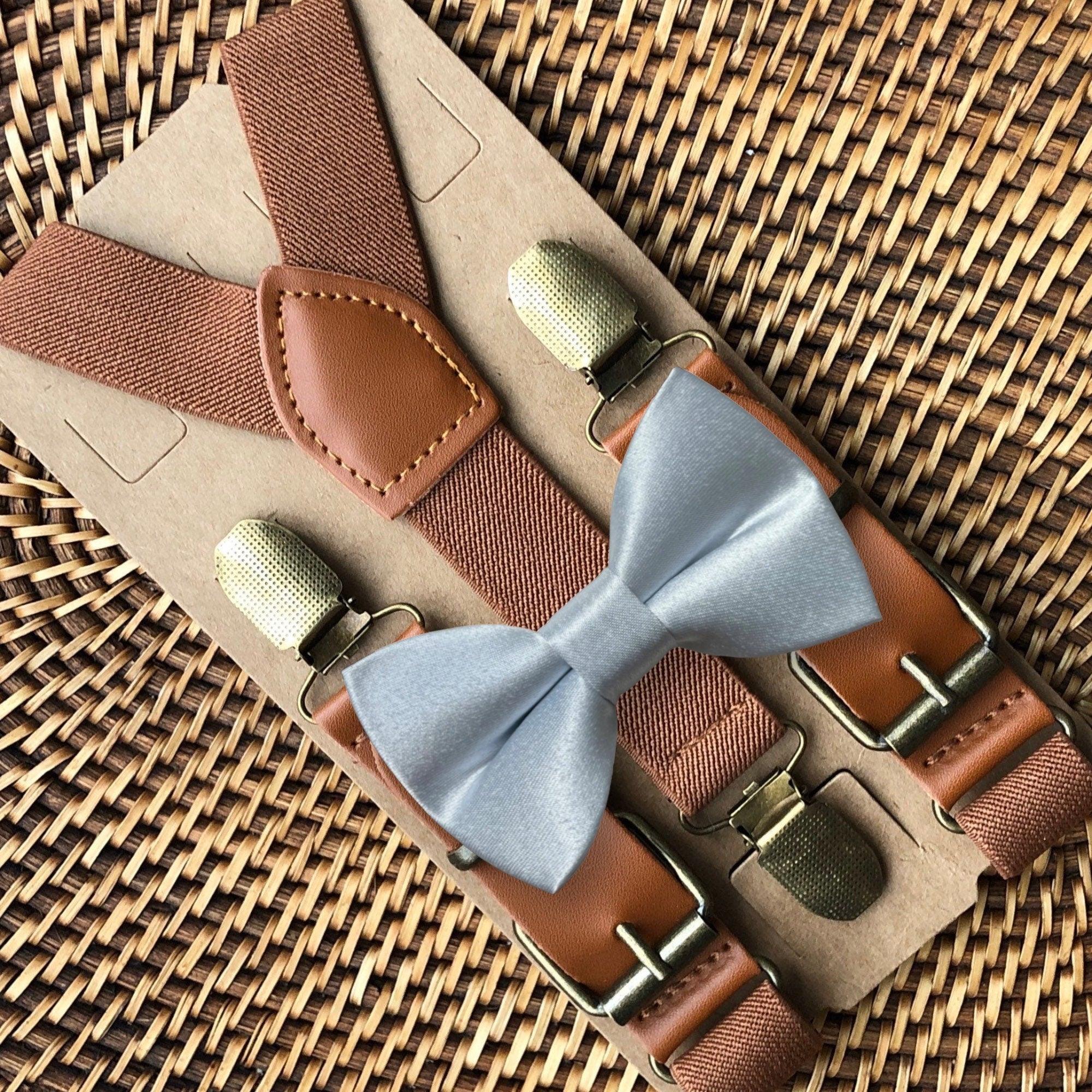 Your special guy will look so handsome when he shows up wearing this light blue bow tie and brown suspenders! This bowtie & suspenders set is a great choice for a ring bearer gift, dusty blue wedding, ring bearer outfit, weddings, ring bearer proposal or any other special occasion.