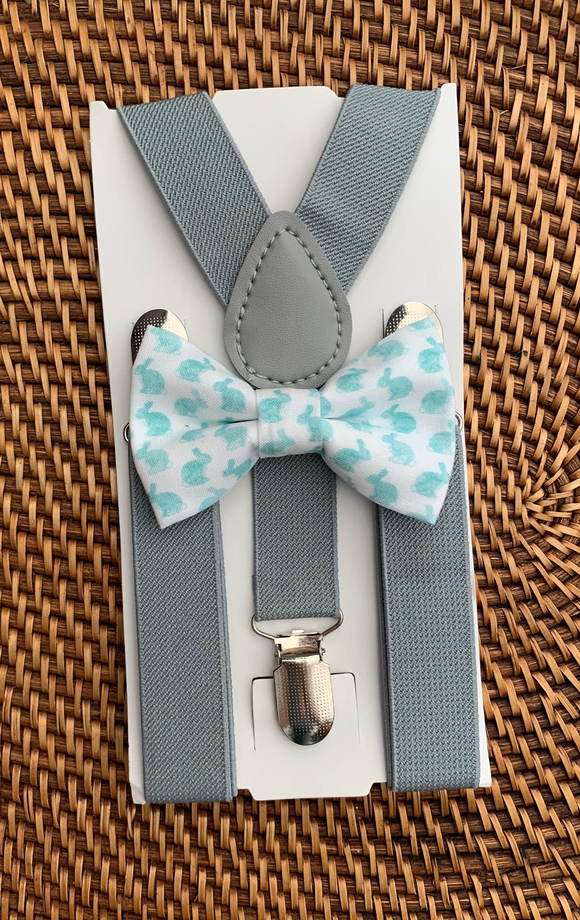 Blue Watercolor Easter Bunny Bow Tie & Light Grey Suspenders Set- Your special guy will look so handsome when he shows up wearing this Easter bow tie and suspenders! It is a great choice for Easter, family photos, ring bearer outfit, wedding, birthday celebration or any other special occasion.