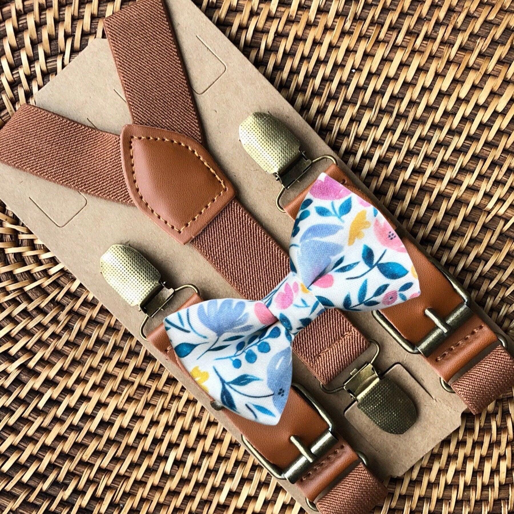 This floral bow tie & vegan leather brown suspenders set is a great choice for family photos, blue bow tie, groomsmen gift, weddings, ring bearer outfit, birthday celebration or any other special occasion.