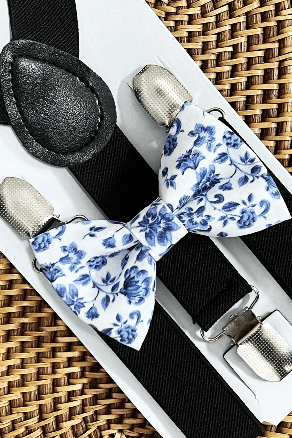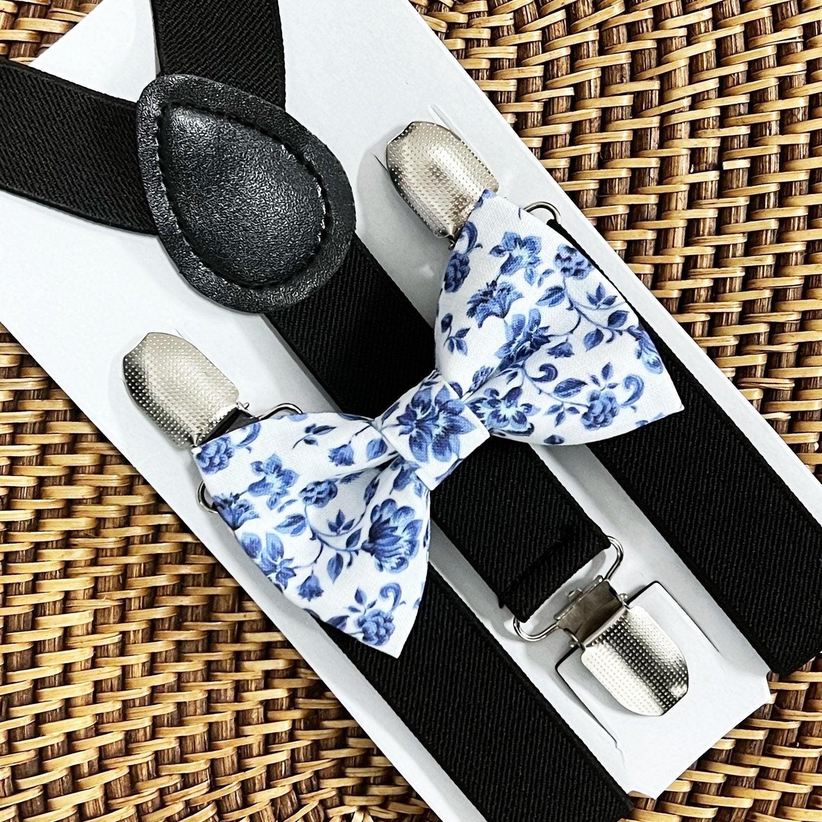 Our French blue floral bow tie, & black suspenders with silver clips is perfect for a groomsman bowtie, ring bearer outfit, dusty blue wedding, boho wedding, ring bearer gift, provincial blue floral tie, groomsmen, or any other special occasion.