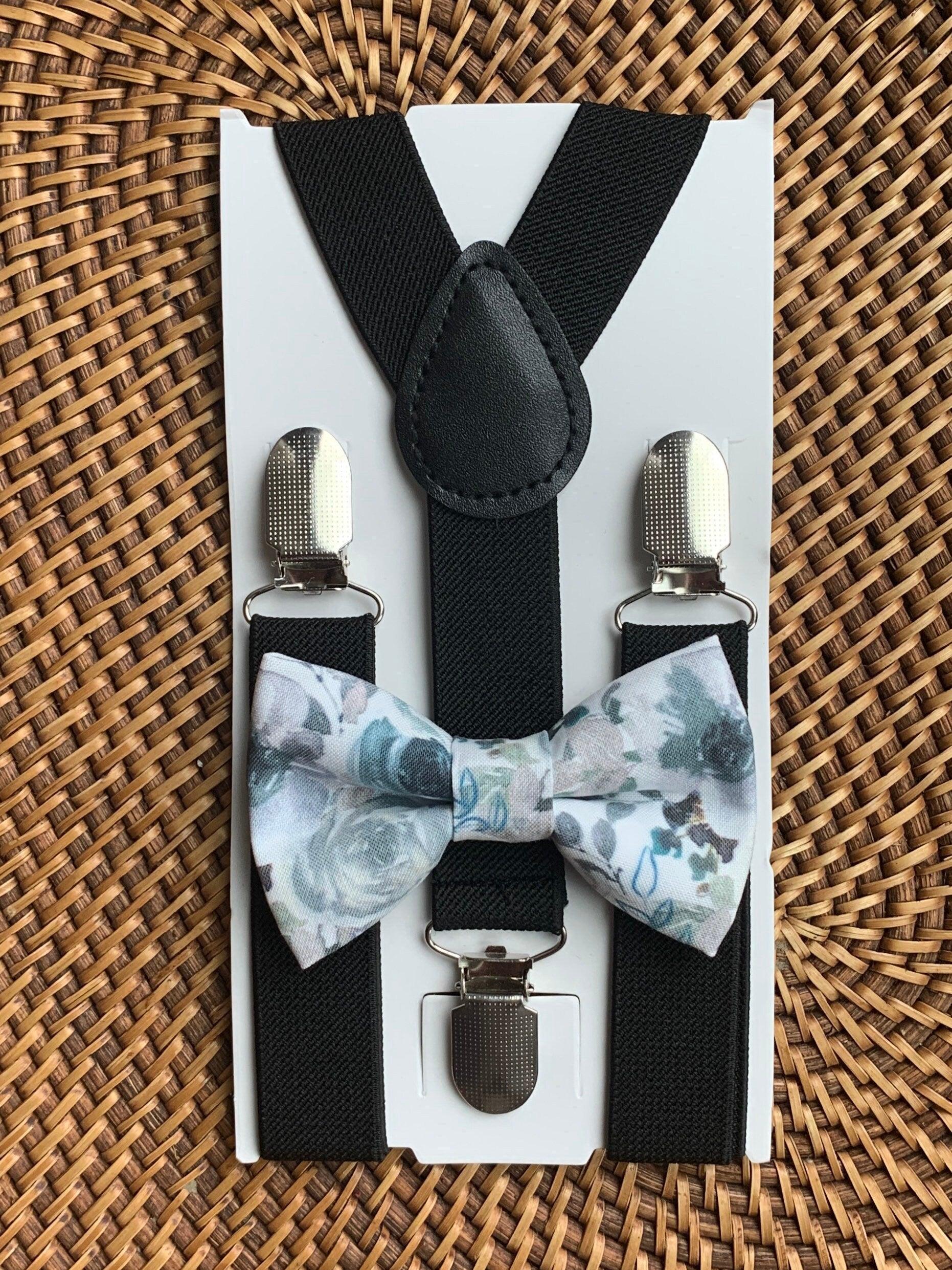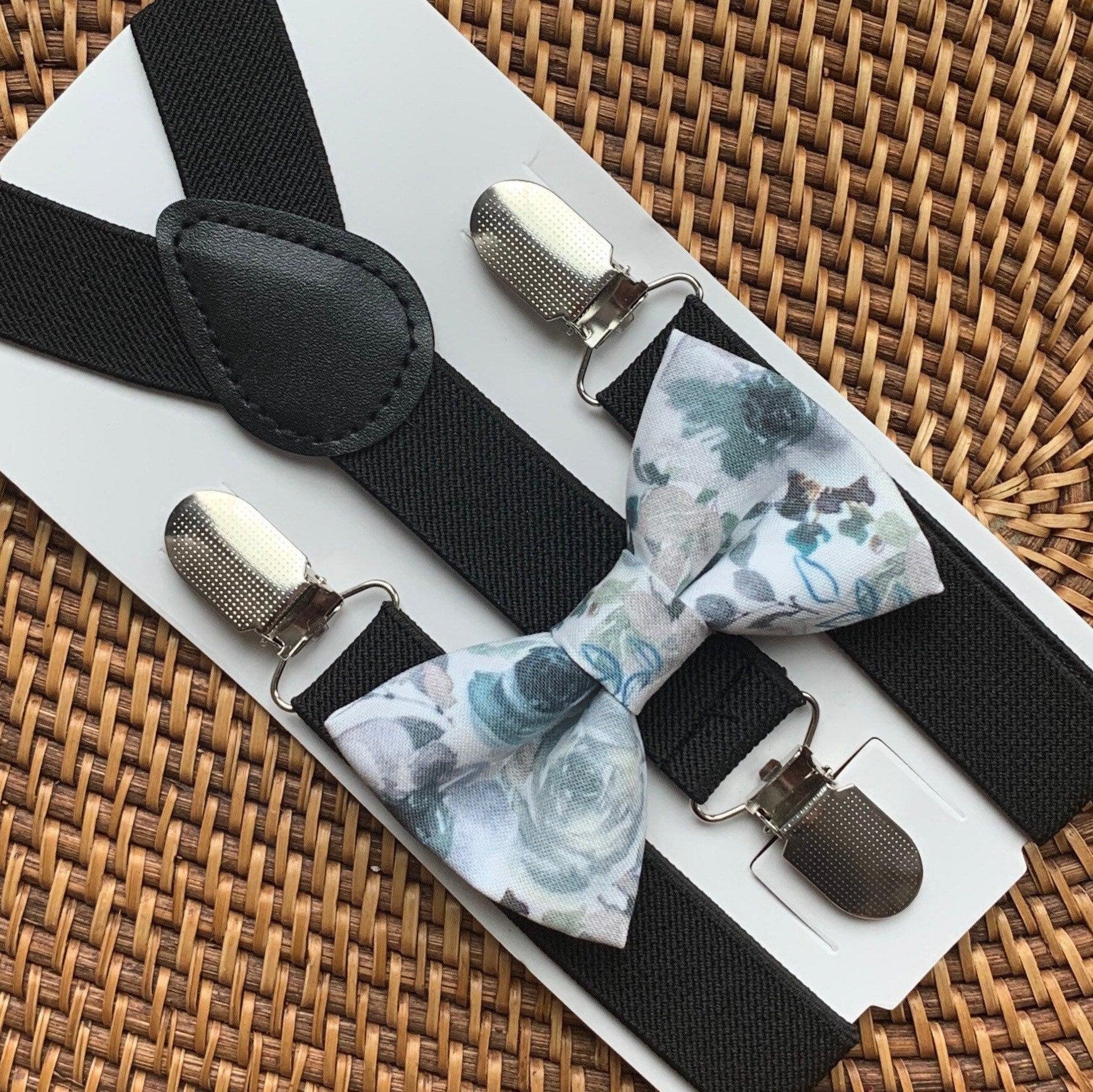 Your special guy will look so handsome when he shows up wearing this charming grey floral bow tie and black suspenders set! This bow tie is a great choice for family photos, weddings, ring bearer outfit, birthday celebration or any other special occasion.