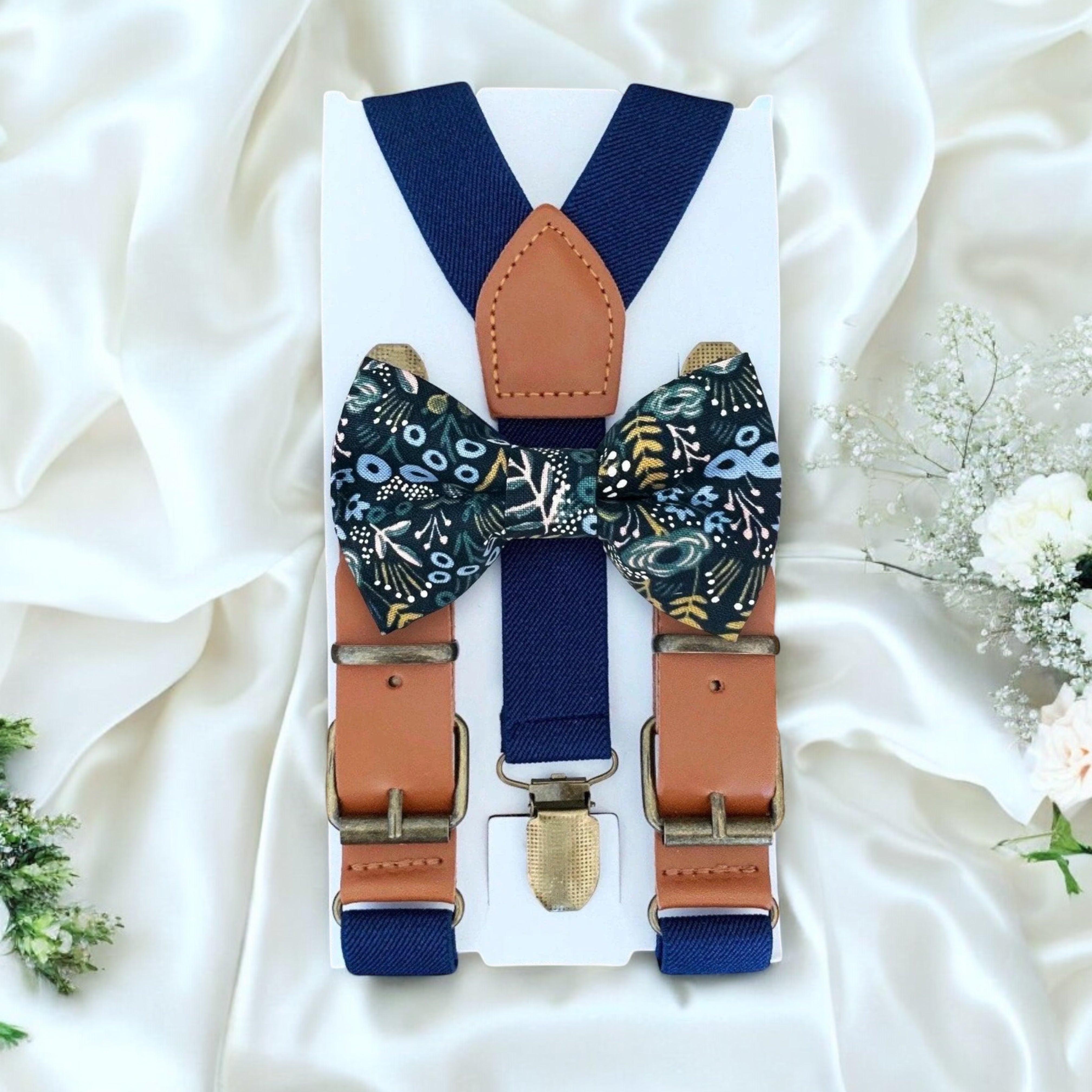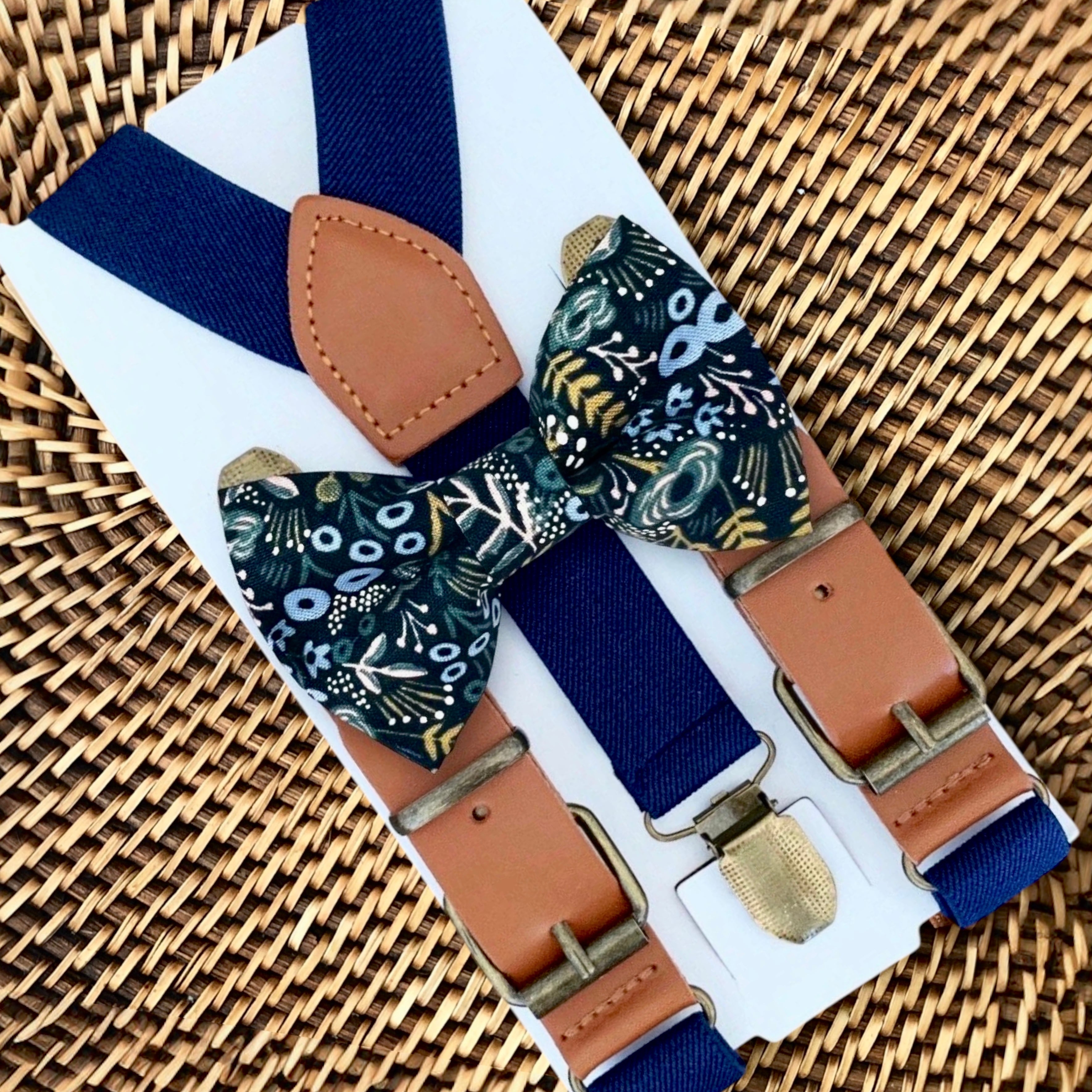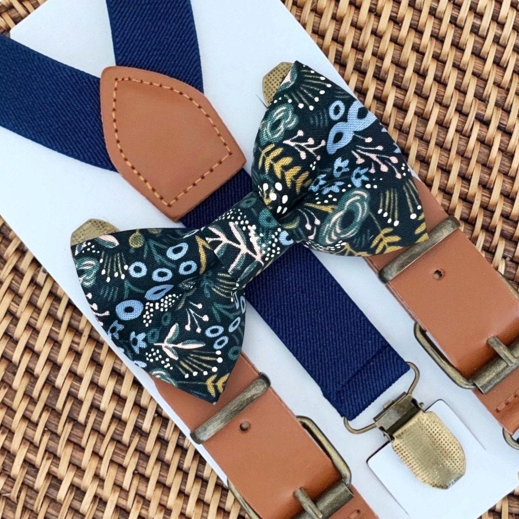 This navy floral bow tie & suspender set is a great choice for a boys bow tie, mens bow ties, wedding, ring bearer outfit, bowtie and suspenders or any other special occasion.