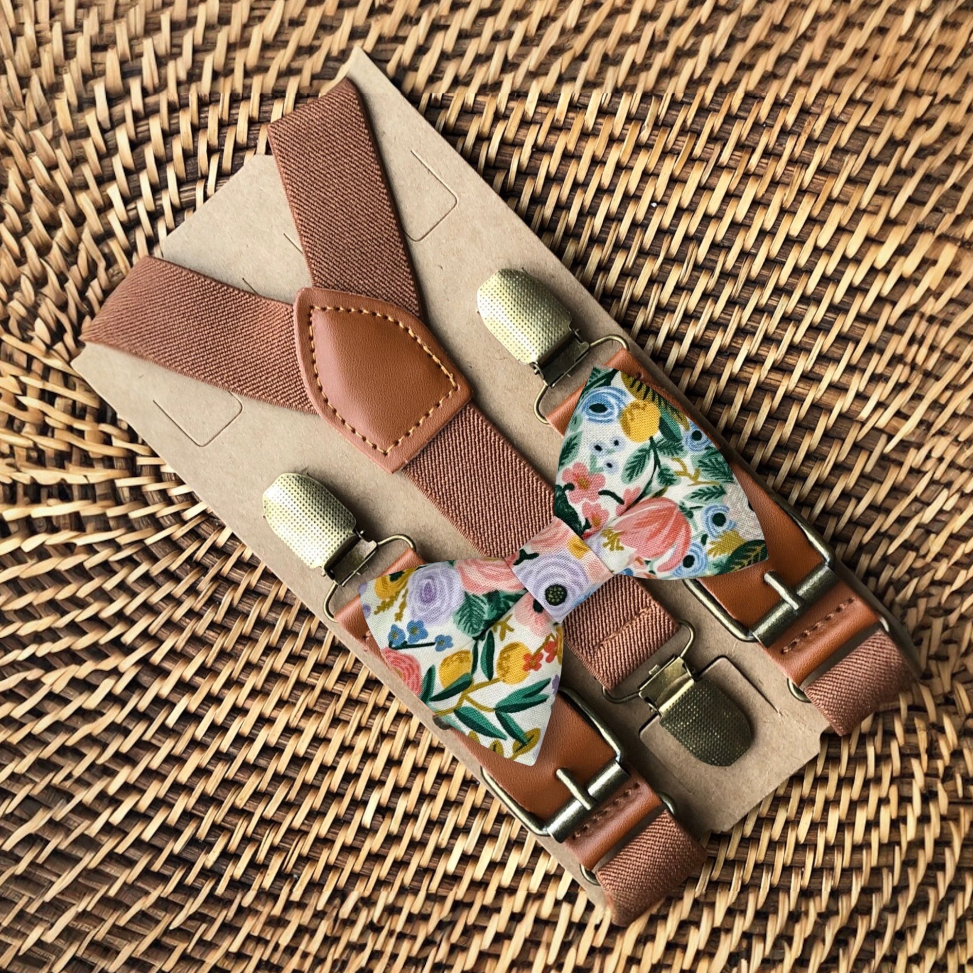White garden floral bow tie and brown suspenders set- PERFECT for a groomsmen proposal box for a wedding, bowties for a ring bearer outfit, or for any other special occasion.