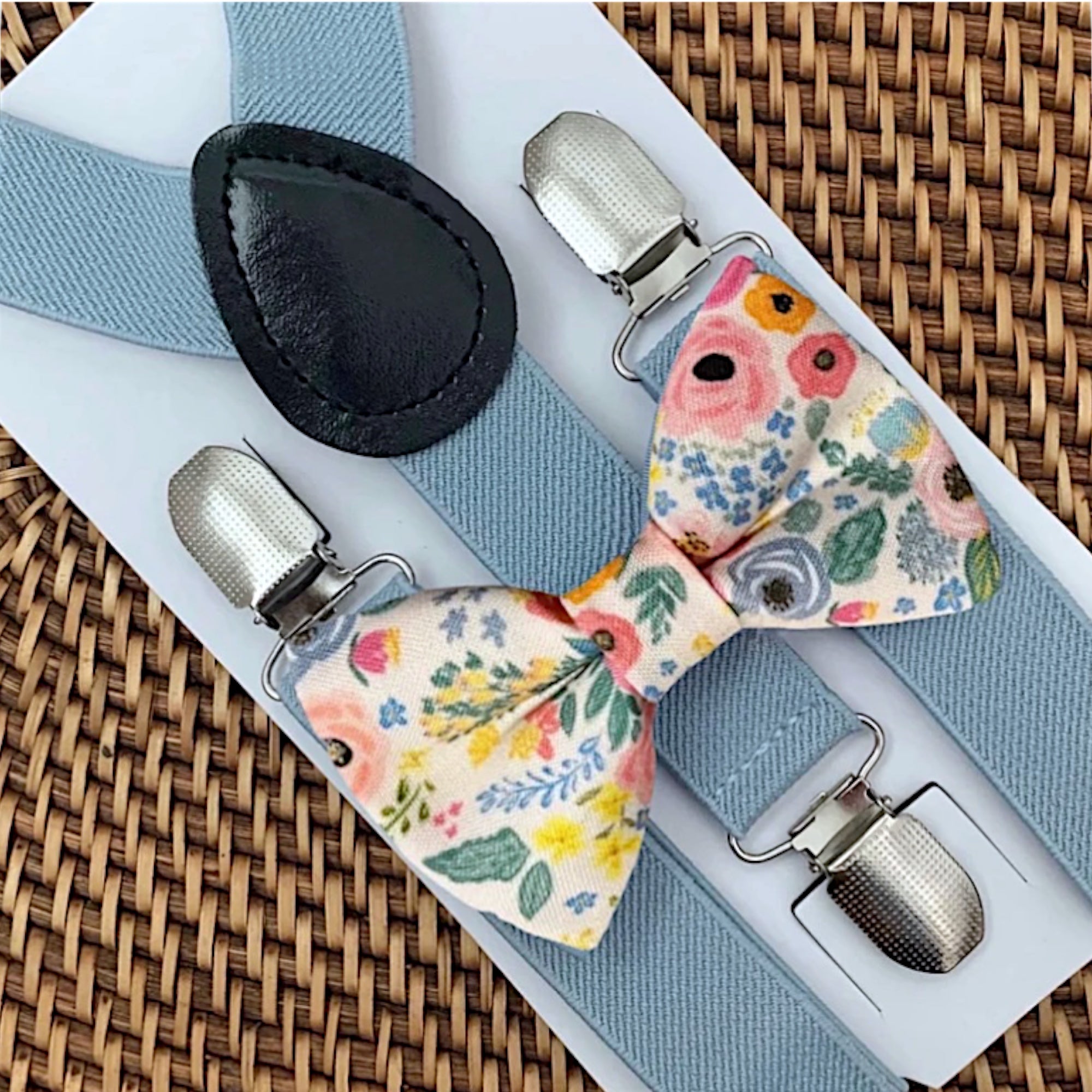 Our Wonderland Garden Bow Tie & Dusty Blue Suspenders are a beautiful choice for toddler suspenders for ring bearer outfit, groomsmen bowtie, baby boy bow ties, toddler bow tie or any other special occasion.