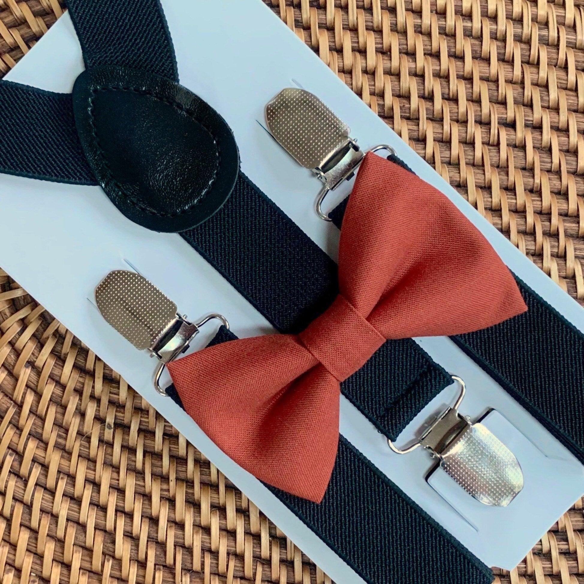 Your special guy will look so handsome when he shows up wearing this charming cinnamon bow tie and dark gray suspenders set! Our burnt orange bow tie is a great choice for family photos, wedding, ring bearer outfit, birthday celebration or any other special occasion.