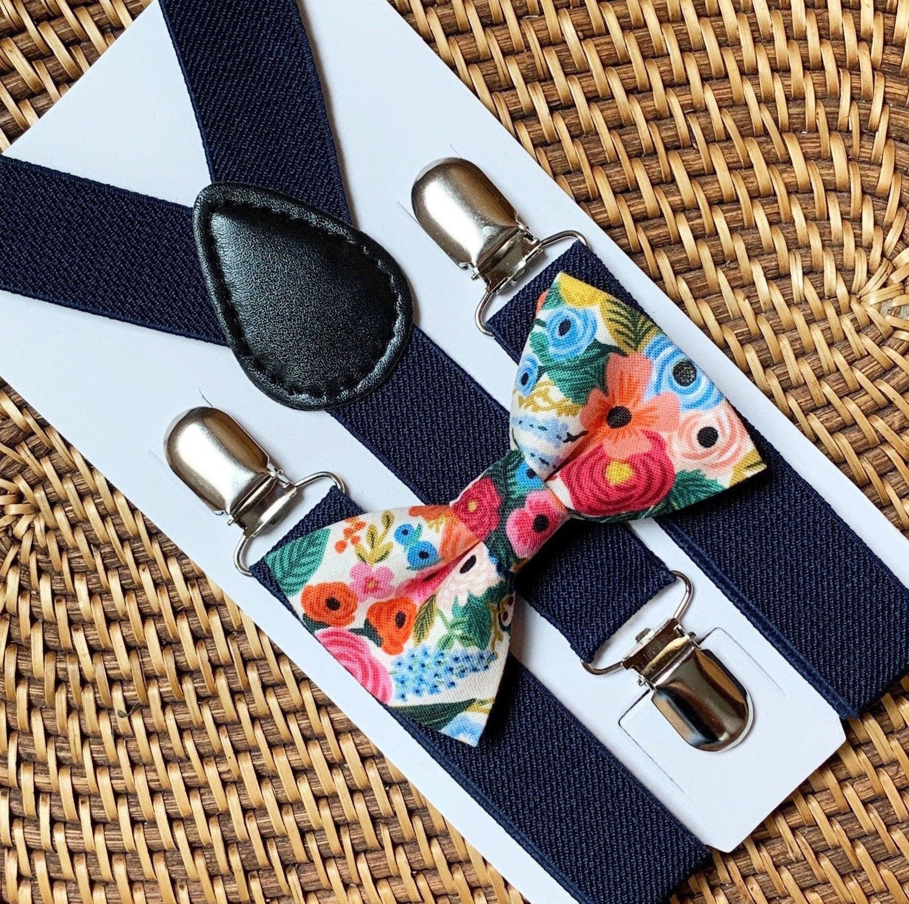 Your special guy will look so handsome when he shows up wearing this Rifle Paper Co bow tie and navy blue buckle suspenders! This floral bow tie & suspender set is a great choice for family photos, wedding, ring bearer outfit, birthday celebration or any other special occasion.