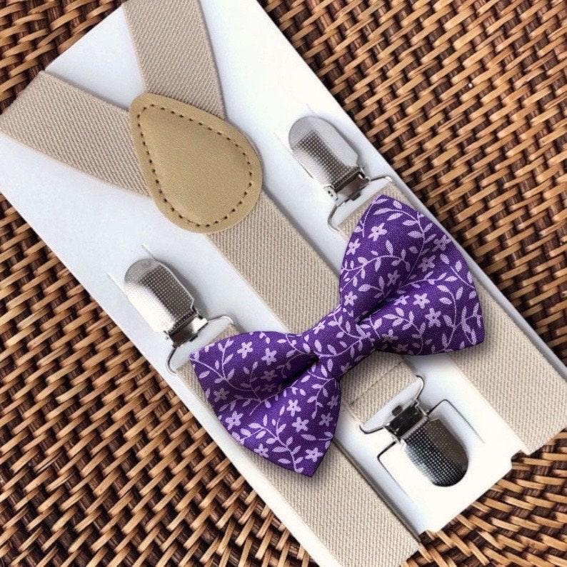 This amythest bow tie & champagne suspenders set is a great choice for a spring wedding, eggplant ring bearer outfit, plum ring bearer gift, grape mens bow tie, purple bow ties for men, groomsmen, or any other special occasion.