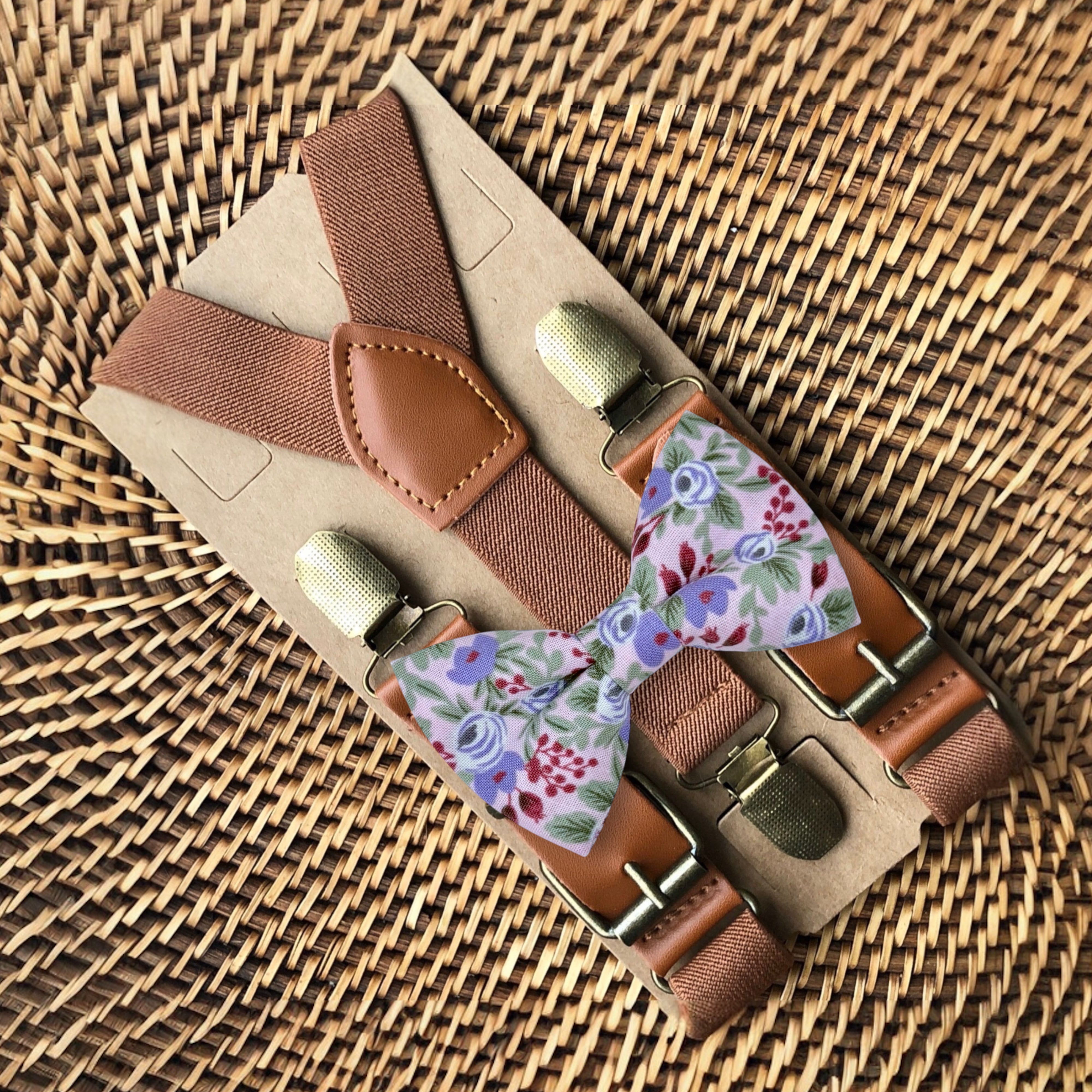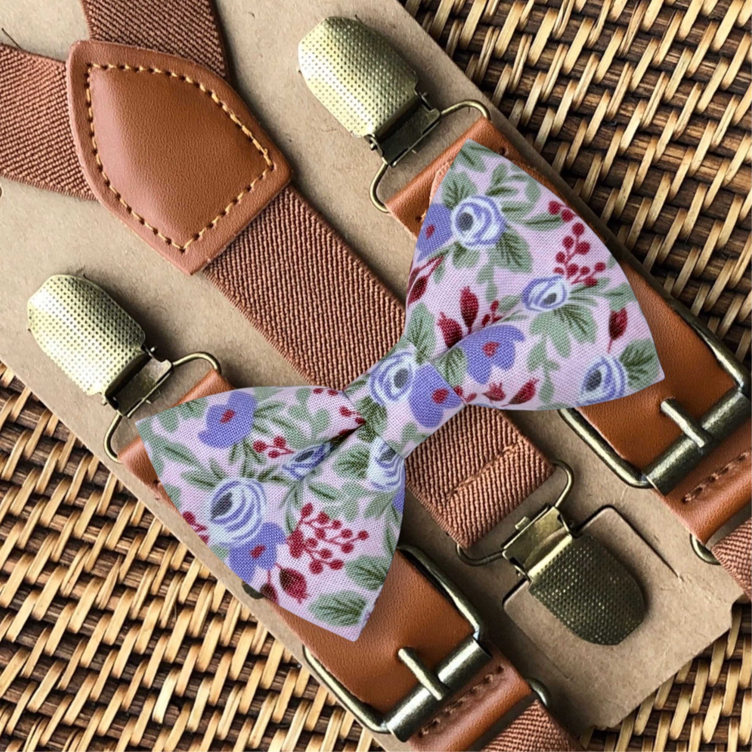 Lavender Floral Bow Tie & Cognac Buckle Brown Suspenders Set