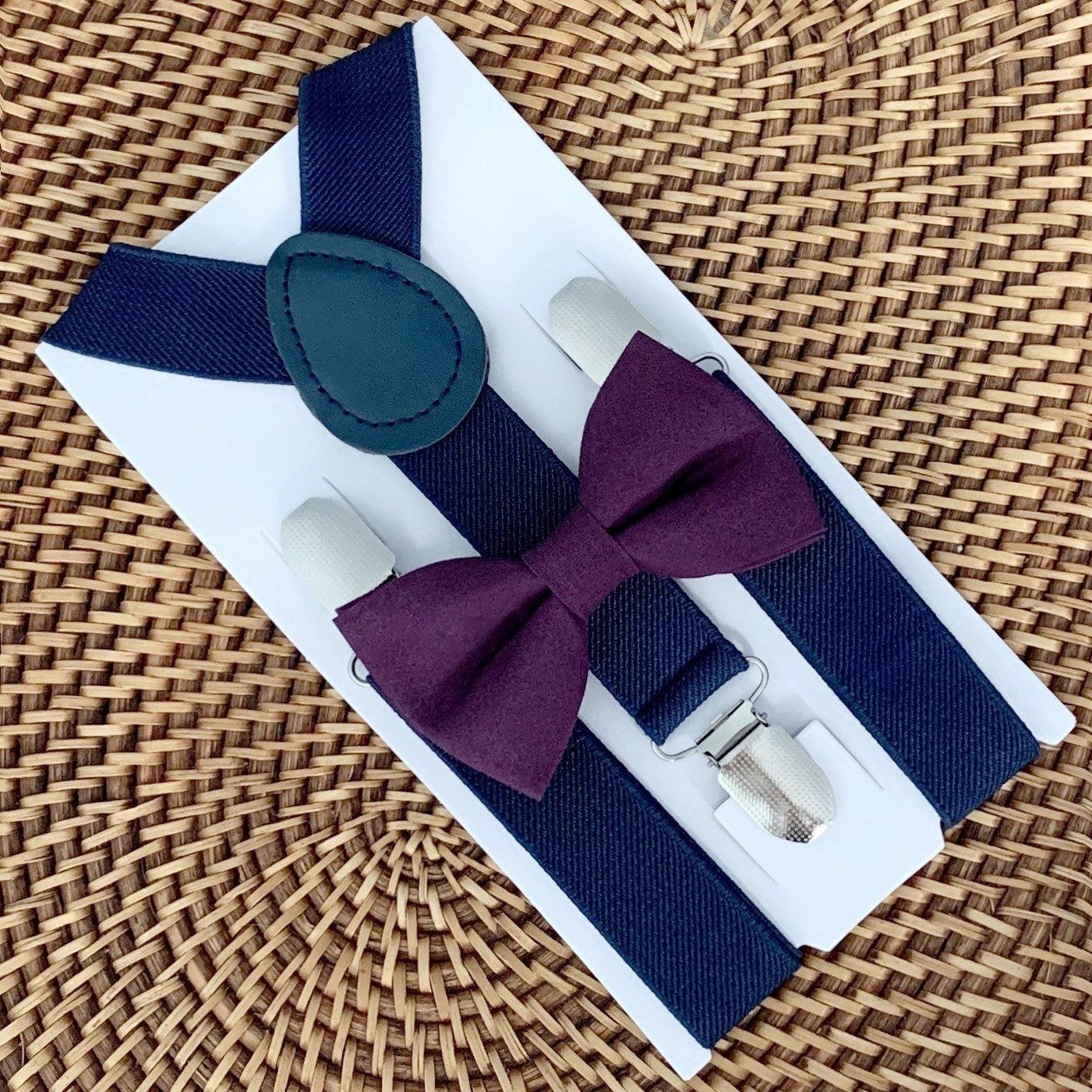 Your special guy will look so handsome when he shows up wearing this fine-looking plum purple bow tie and navy suspenders! This bow tie & suspender set is a great choice for family photos, wedding, ring bearer outfit, birthday celebration or any other special occasion.