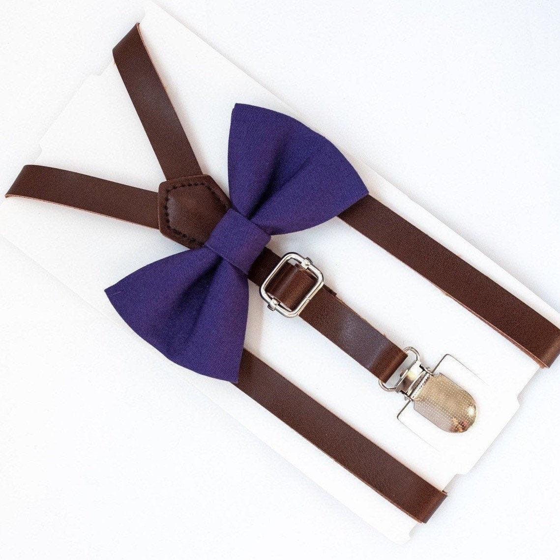 Your special guy will look so dashing when he shows up wearing this purple bow tie and faux leather suspenders set! Our purple bow tie is a great choice for family photos, wedding, ring bearer outfit, birthday celebration or any other special occasion.