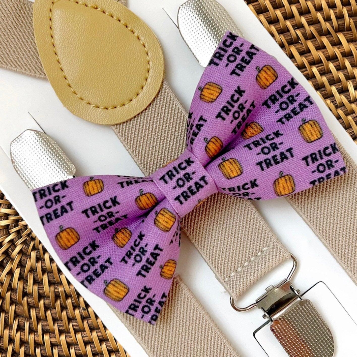 Purple Trick or Treat Bow Tie & Tan Elastic Suspenders