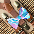Watercolor blue and purple bow tie and brown suspenders set- PERFECT for a bow tie for a ring bearer outfit for garden wedding, groomsmen wedding bowties, or for any other special occasion.