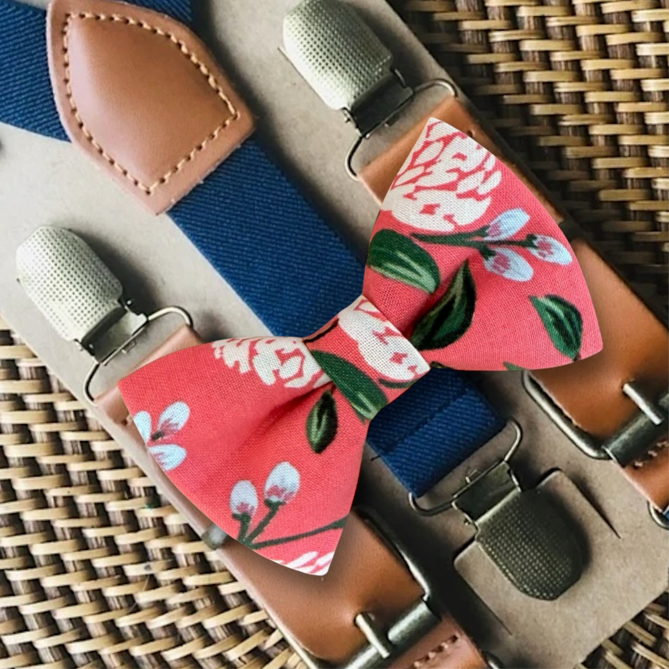 Hydrangea pink bow tie and navy suspenders set- PERFECT for a bow tie for groomsmen, pink wedding bowties for a ring bearer outfit, or for any other special occasion.