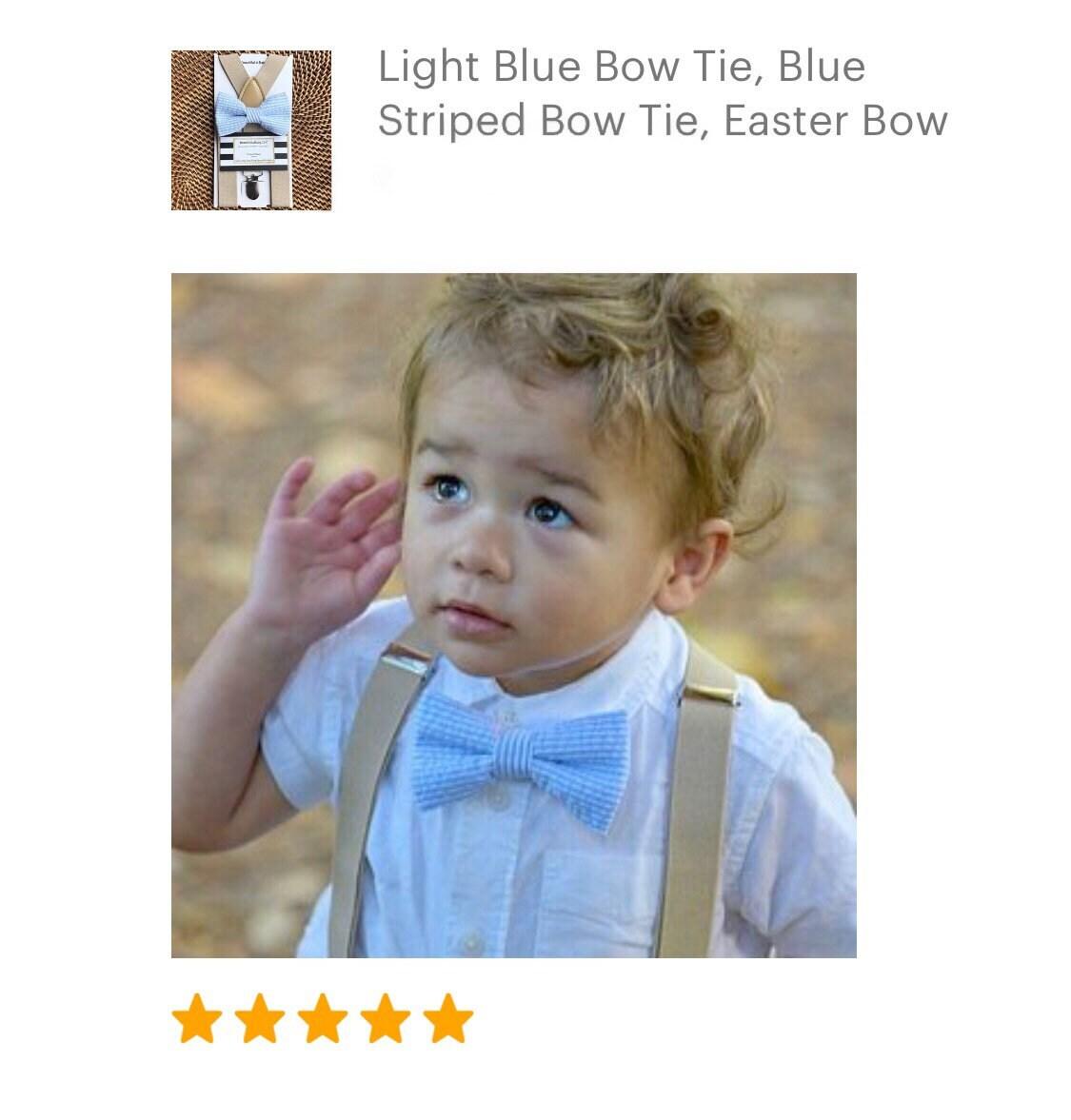 Our Light Blue Seersucker Bow Tie & Tan Suspenders Set is a great choice for a wedding, Easter outfit, groomsmen bowties, ring bearer outfit, birthday celebration or any other special occasion.