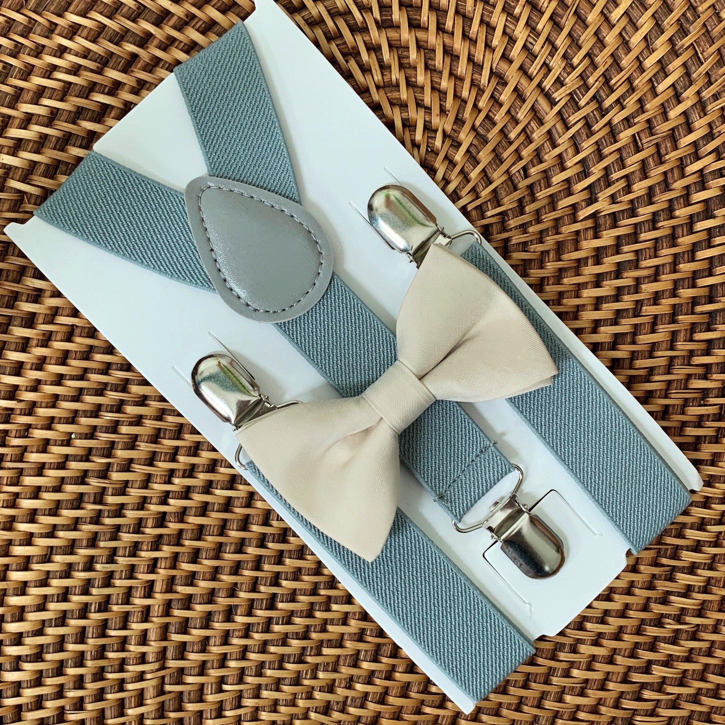 Champagne Bow Tie & Light Grey Suspenders Set- Your special guy will look so dashing when he shows up wearing this fine-looking champagne bow tie and grey suspenders! Our champagne tie is a great choice for family photos, wedding, ring bearer outfit, birthday celebration or any other special occasion.
