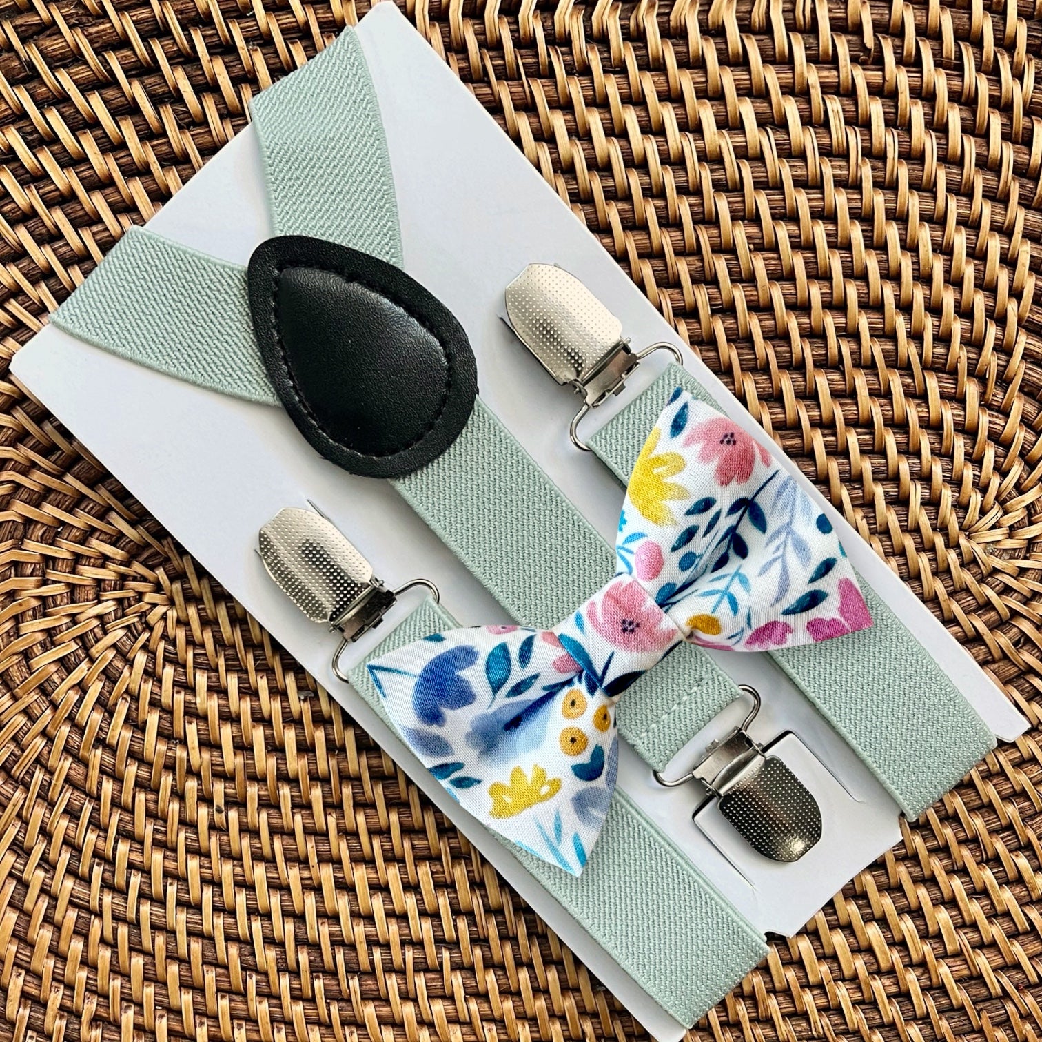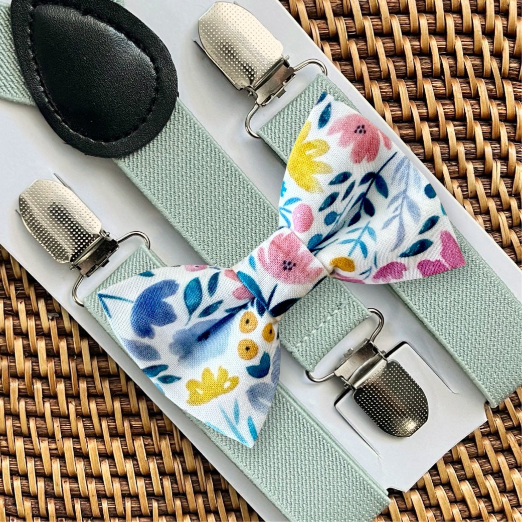 Spring floral bow tie and sage suspenders! This bow tie & suspenders it the perfect way to add a little pop of color to your wedding party.