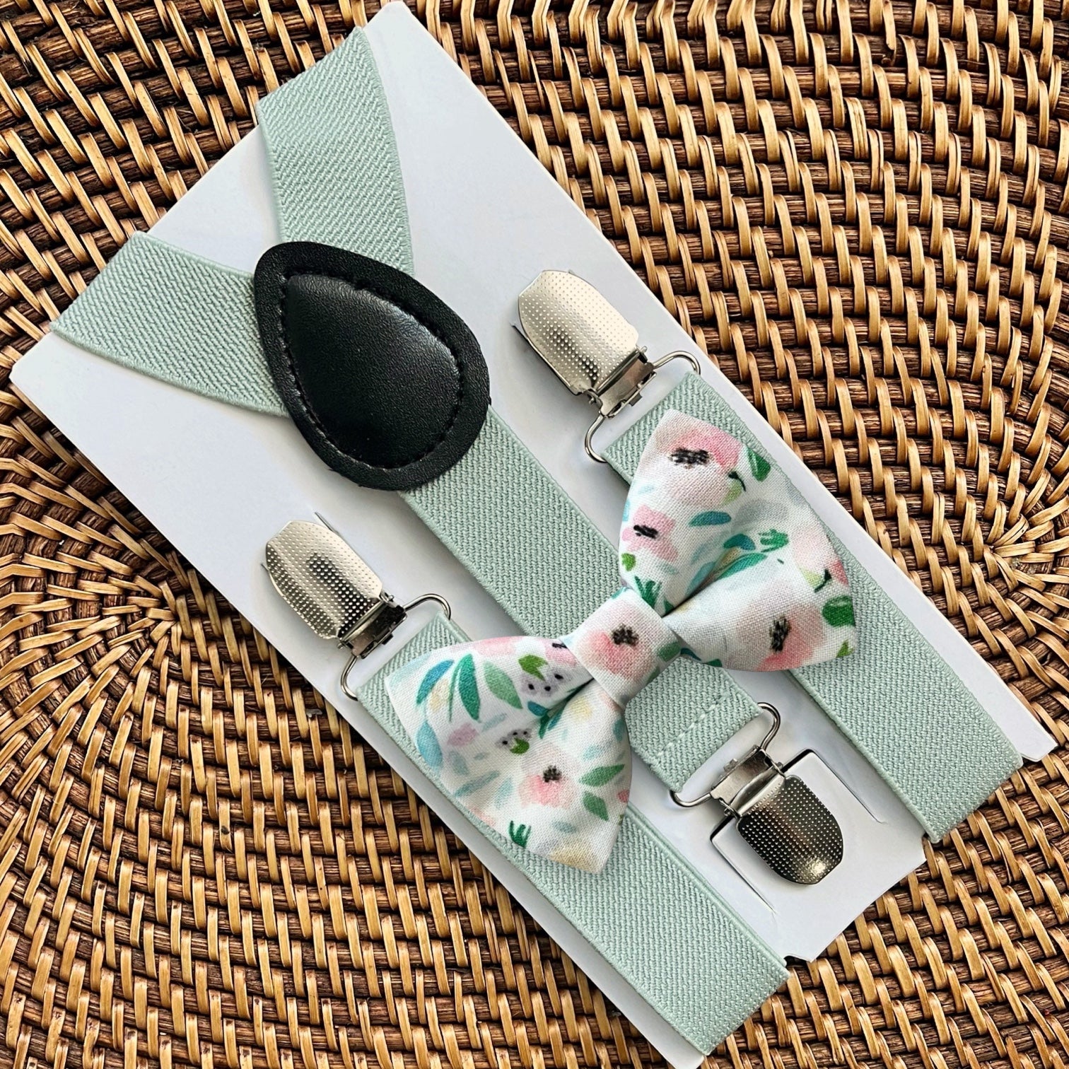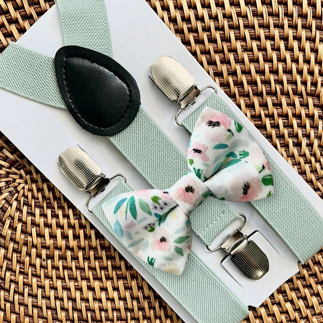 Floral sage green bow tie and sage suspenders! This bow tie & suspenders set will wow your guests when worn by groomsmen or little ring bearers!