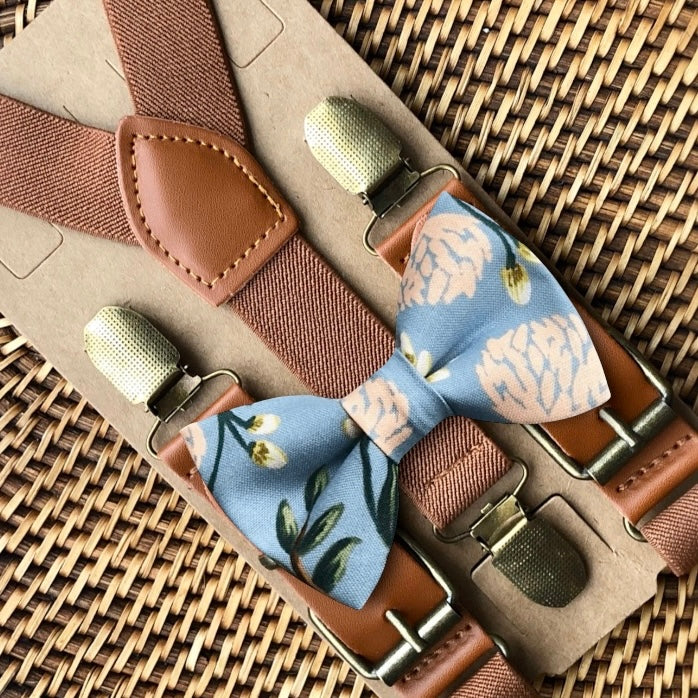 Dusty blue hydrangea bow tie and brown suspenders set- PERFECT for a bow tie for groomsmen, wedding bowties for a ring bearer outfit, or for any other special occasion.