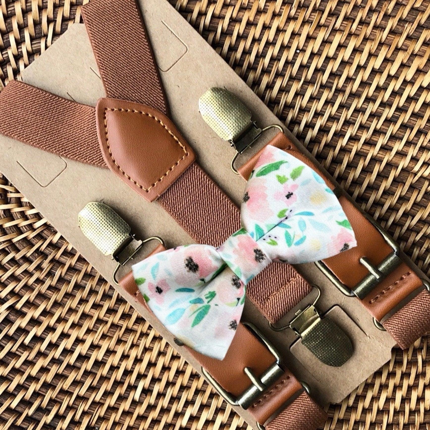 This floral bow tie & vegan leather brown suspenders set is a great choice for family photos, blue bow tie, groomsmen gift, weddings, ring bearer outfit, birthday celebration or any other special occasion.
