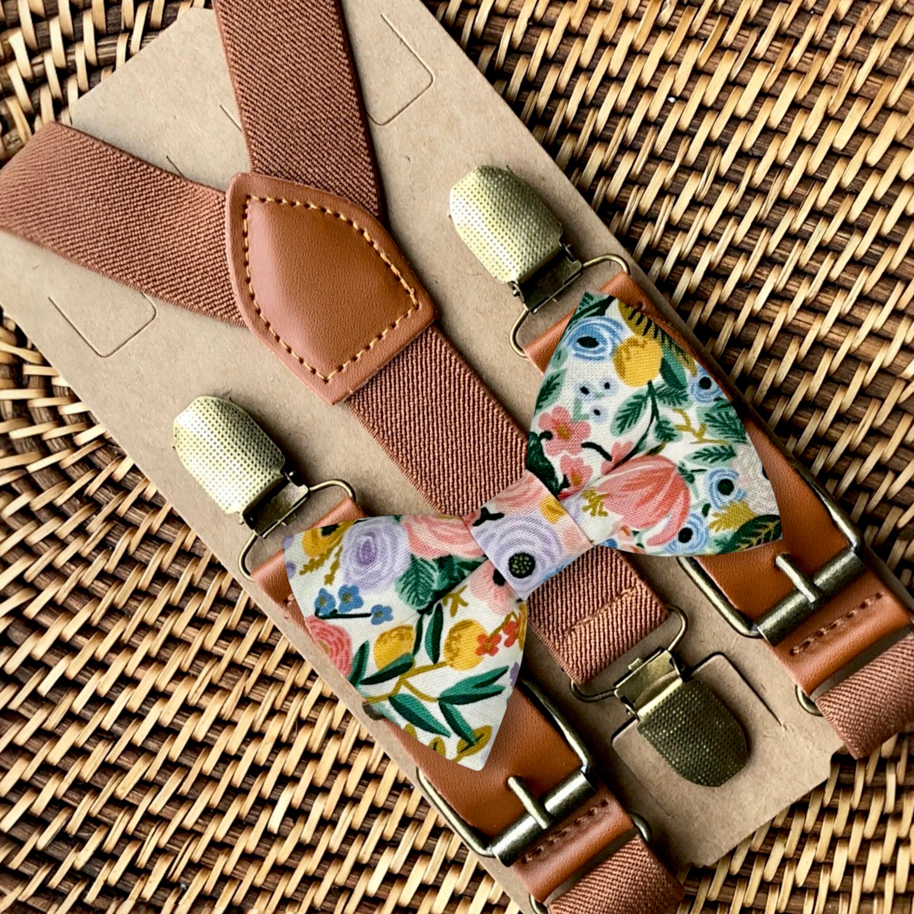 White garden floral bow tie and brown suspenders set- PERFECT for a groomsmen proposal box for a wedding, bowties for a ring bearer outfit, or for any other special occasion.