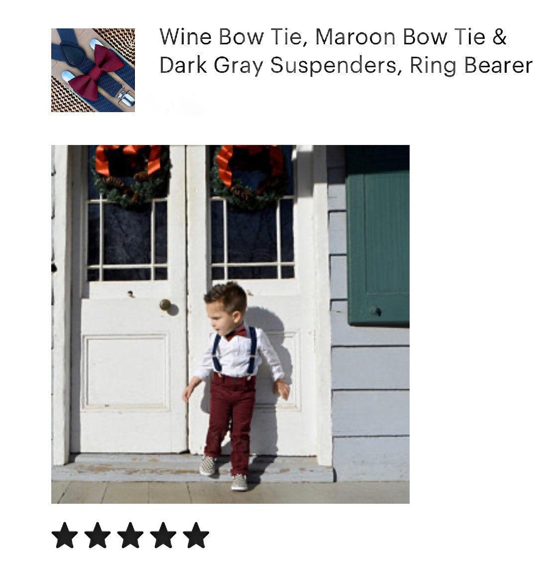 Burgundy Bow Tie & Dark Gray Suspenders Set- Your special guy will look so handsome when he shows up wearing this fine-looking burgundy bow tie and dark gray suspenders! The burgundy bow tie is a great choice for family photos, wedding, ring bearer outfit, birthday celebration or any other special occasion.