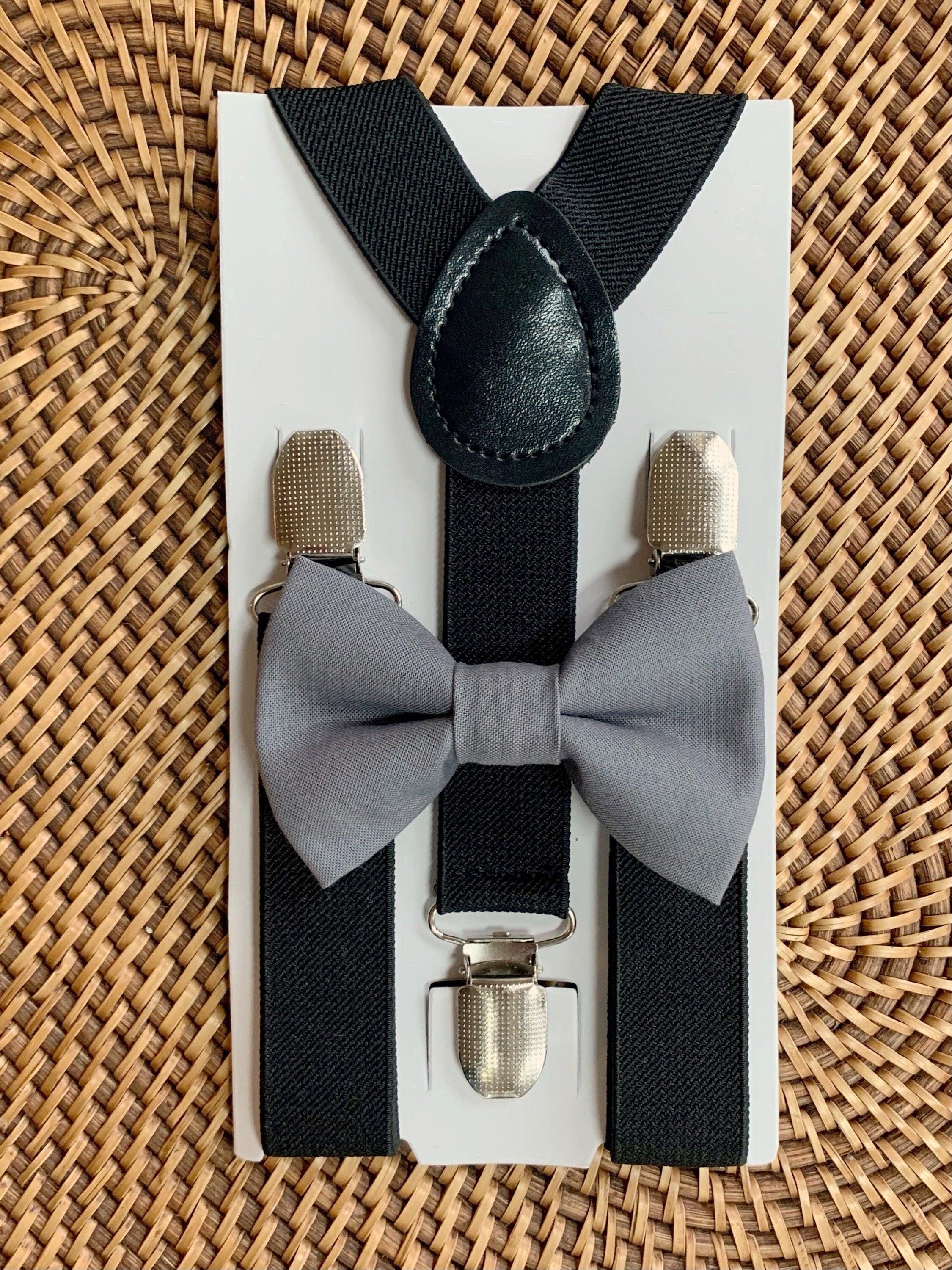 Your special guy will look so handsome when he shows up wearing this charming graphite bow tie and black suspenders set! Our gray bow tie is a great choice for family photos, wedding, ring bearer outfit, birthday celebration or any other special occasion.