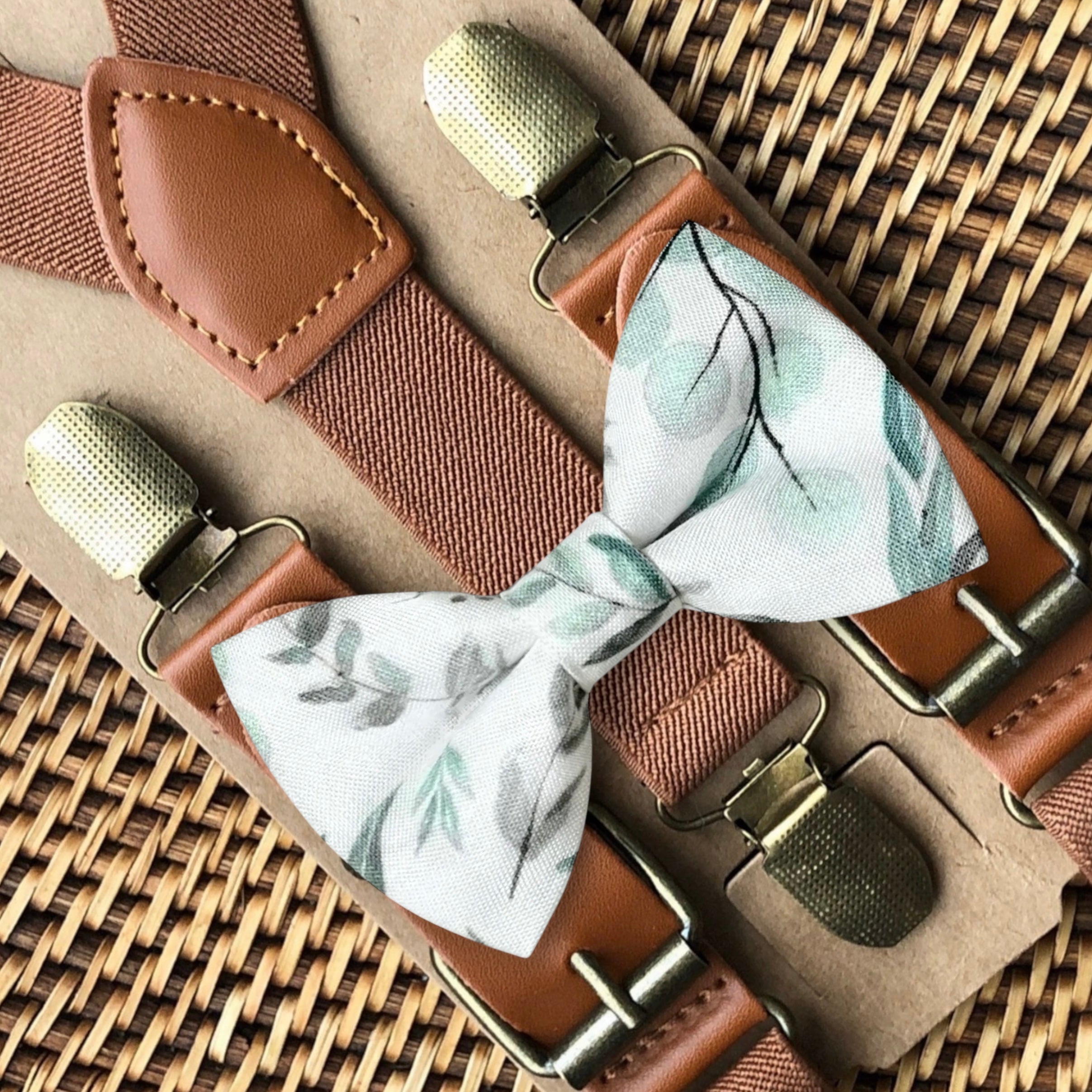 Sage Floral Bow Tie & Cognac Buckle Suspenders Set- This floral sage bow tie & brown suspender set is a great choice for ring bearer gift, ring bearer outfit, bowtie, floral bow tie, boho wedding, green bow tie, eucalyptus wedding, or any other special occasion.
