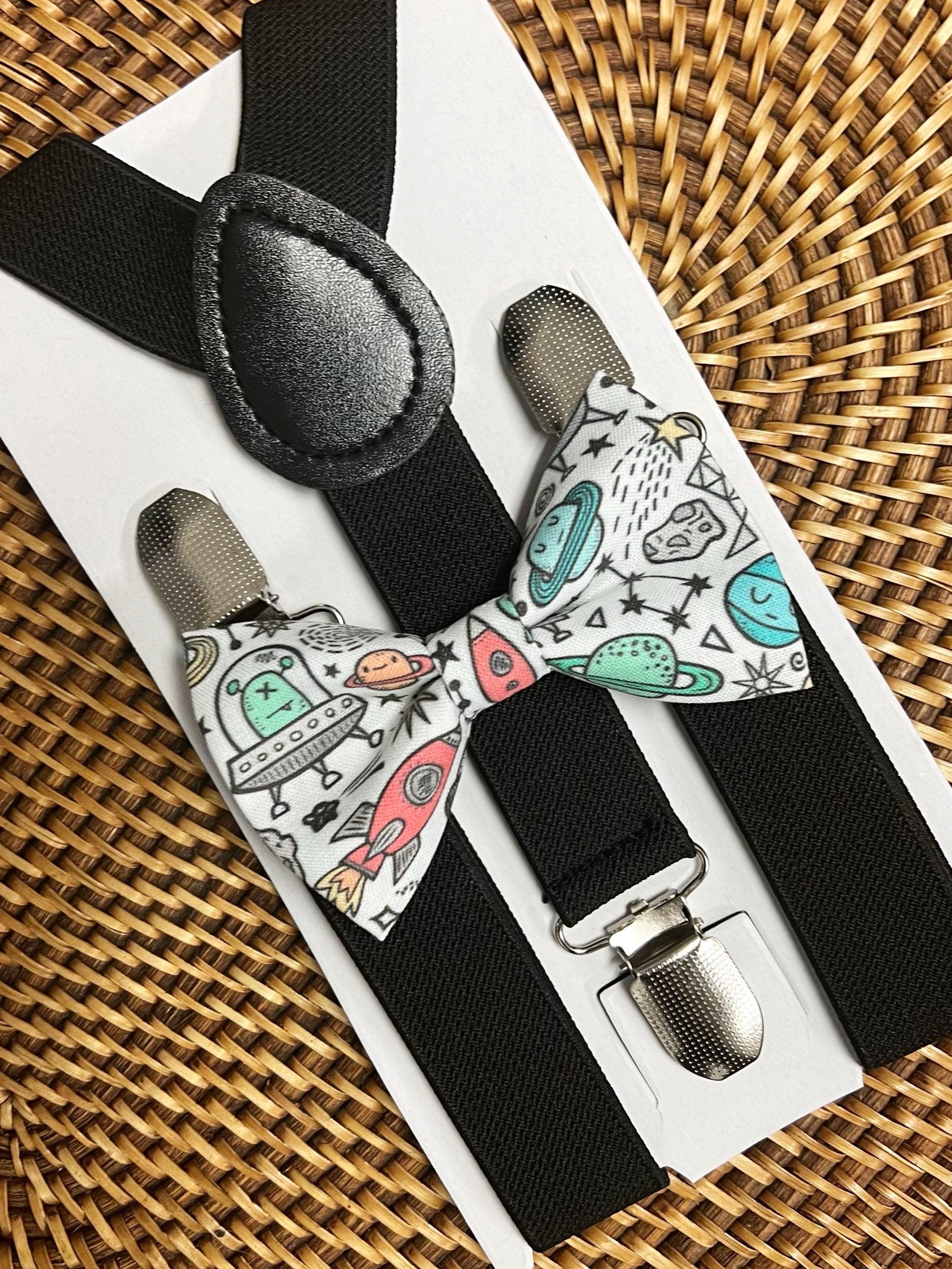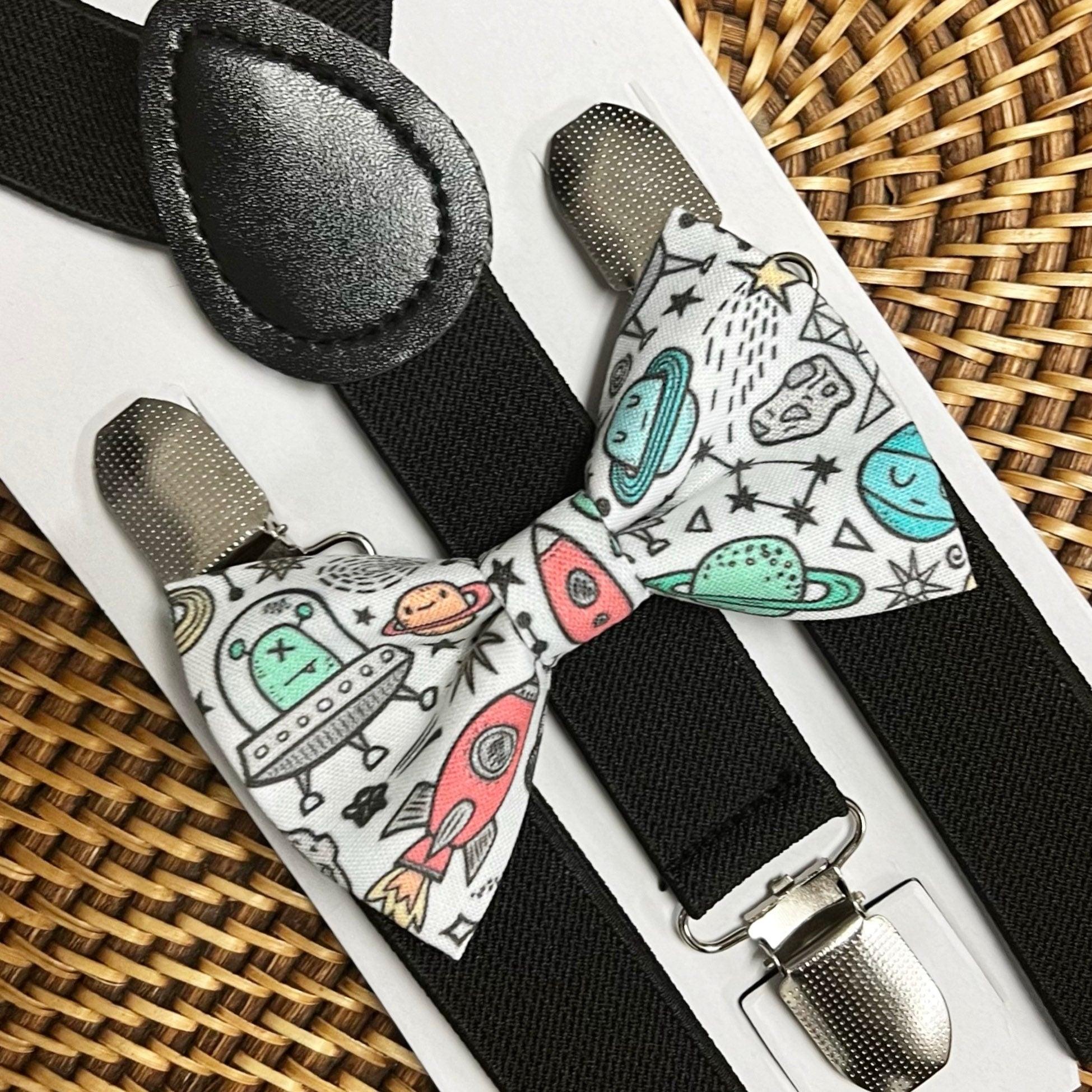 Our Outer Space Bow Tie & Black Suspenders Set is the PERFECT choice for toddler suspenders for toddler boy clothes, baby boy bow ties, celestial groomsmen attire, a ring bearer gift or any other special occasion.