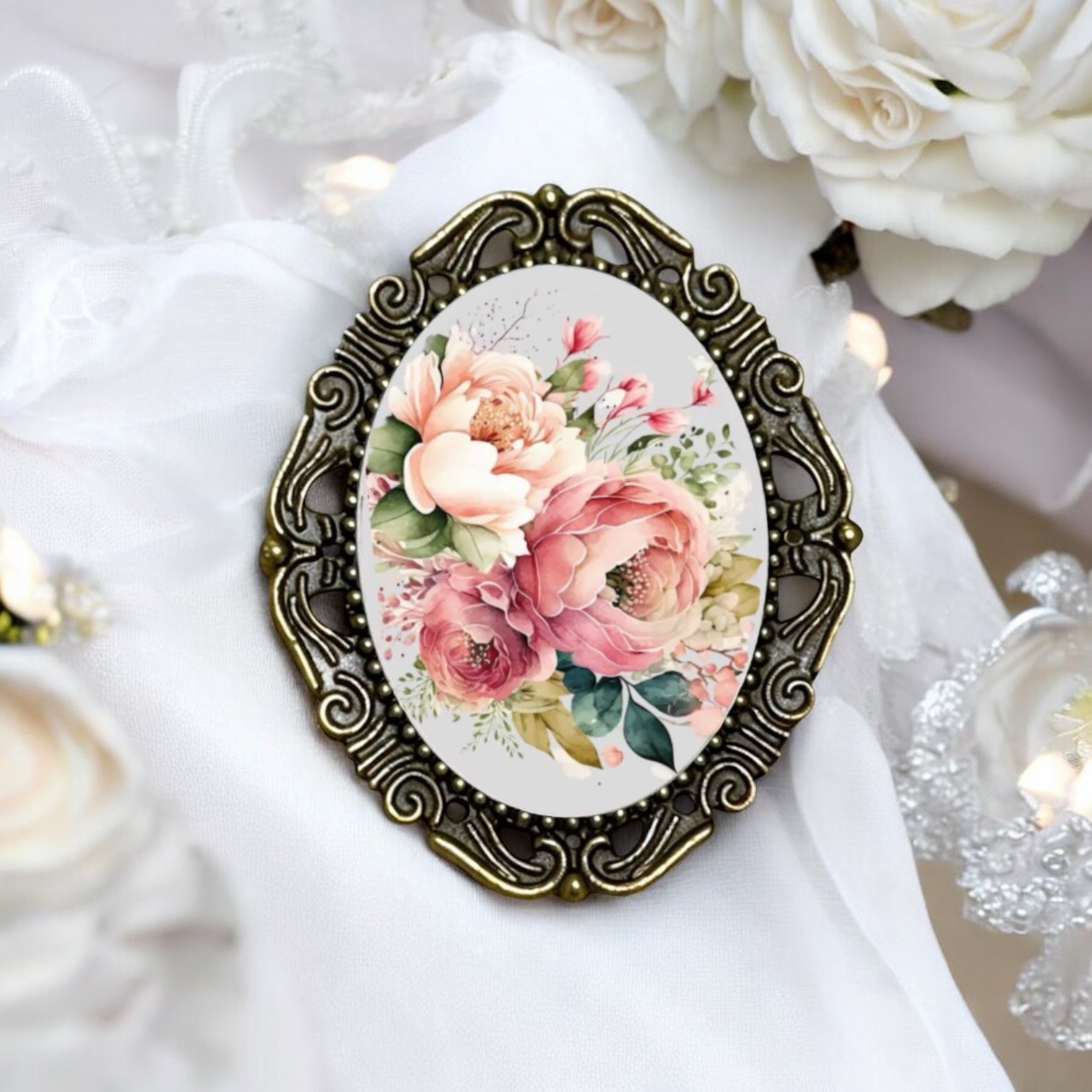 Hydrangea brooch- pinks and oranges in an antiqued brass setting with silver pin back. PERFECT for Mother's Day cameo brooch for women, birthday gift with wildflowers, or a vintage brooch pin for yourself! The lovely picture is meticulously topped with a glass cover.