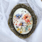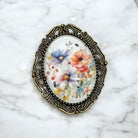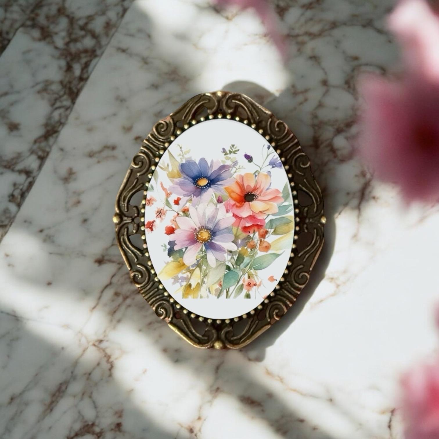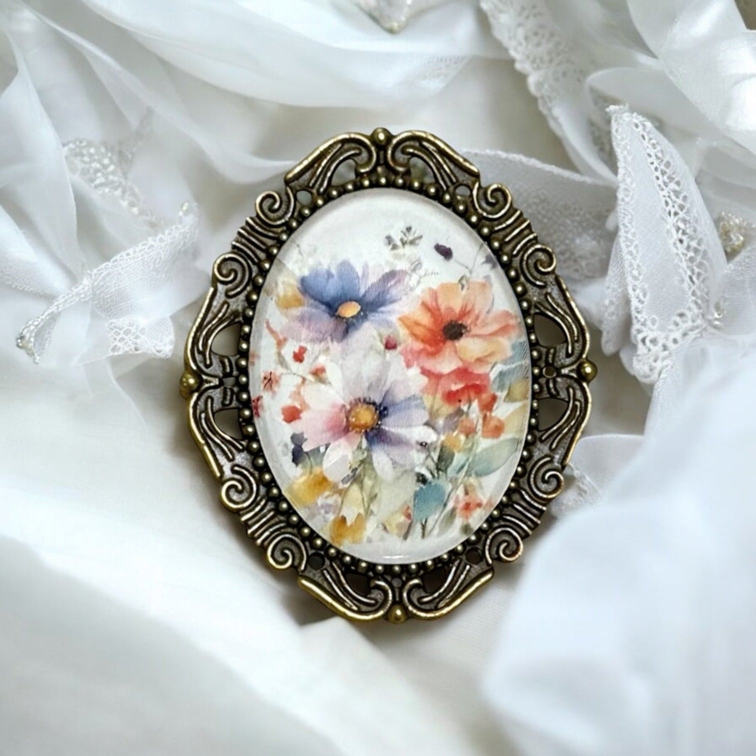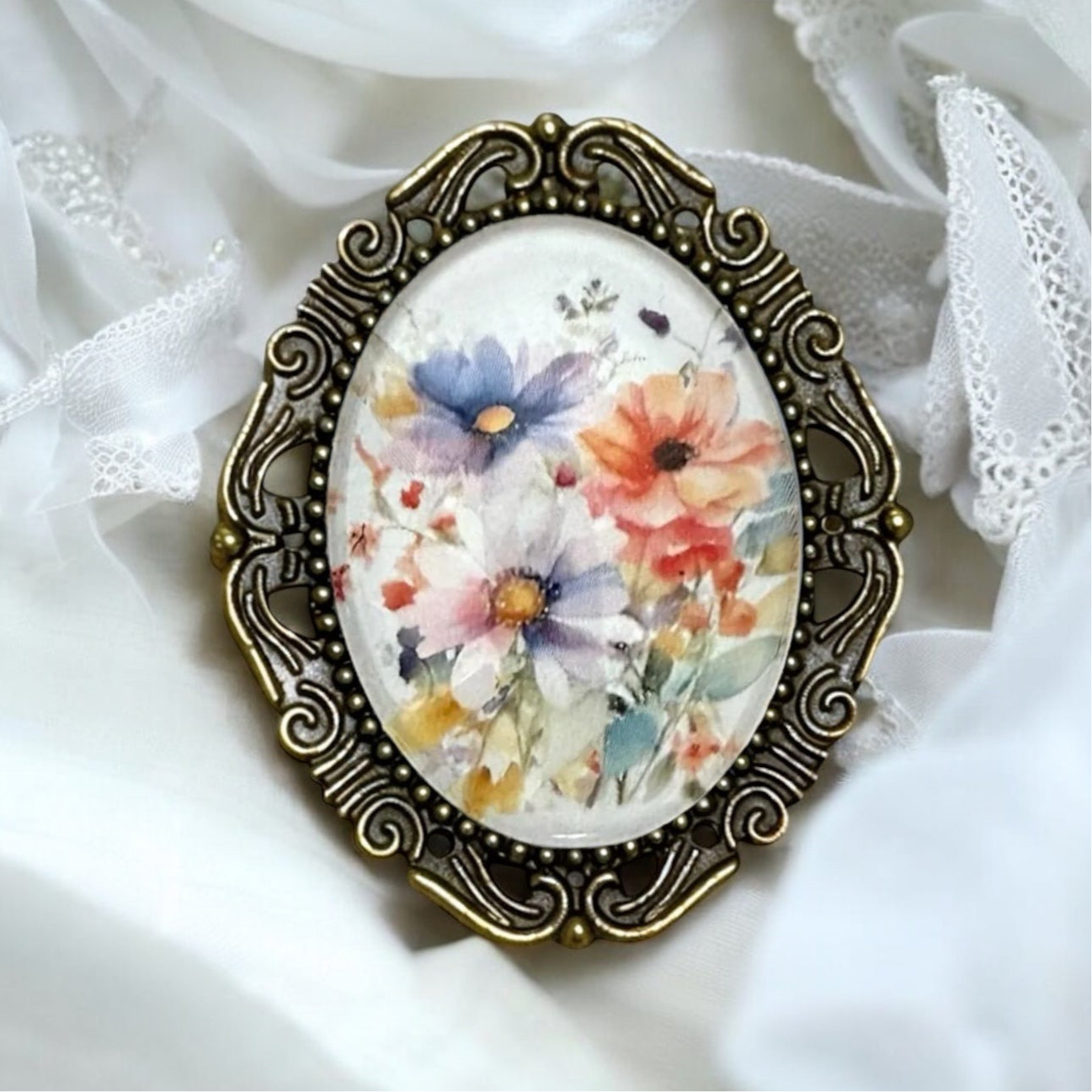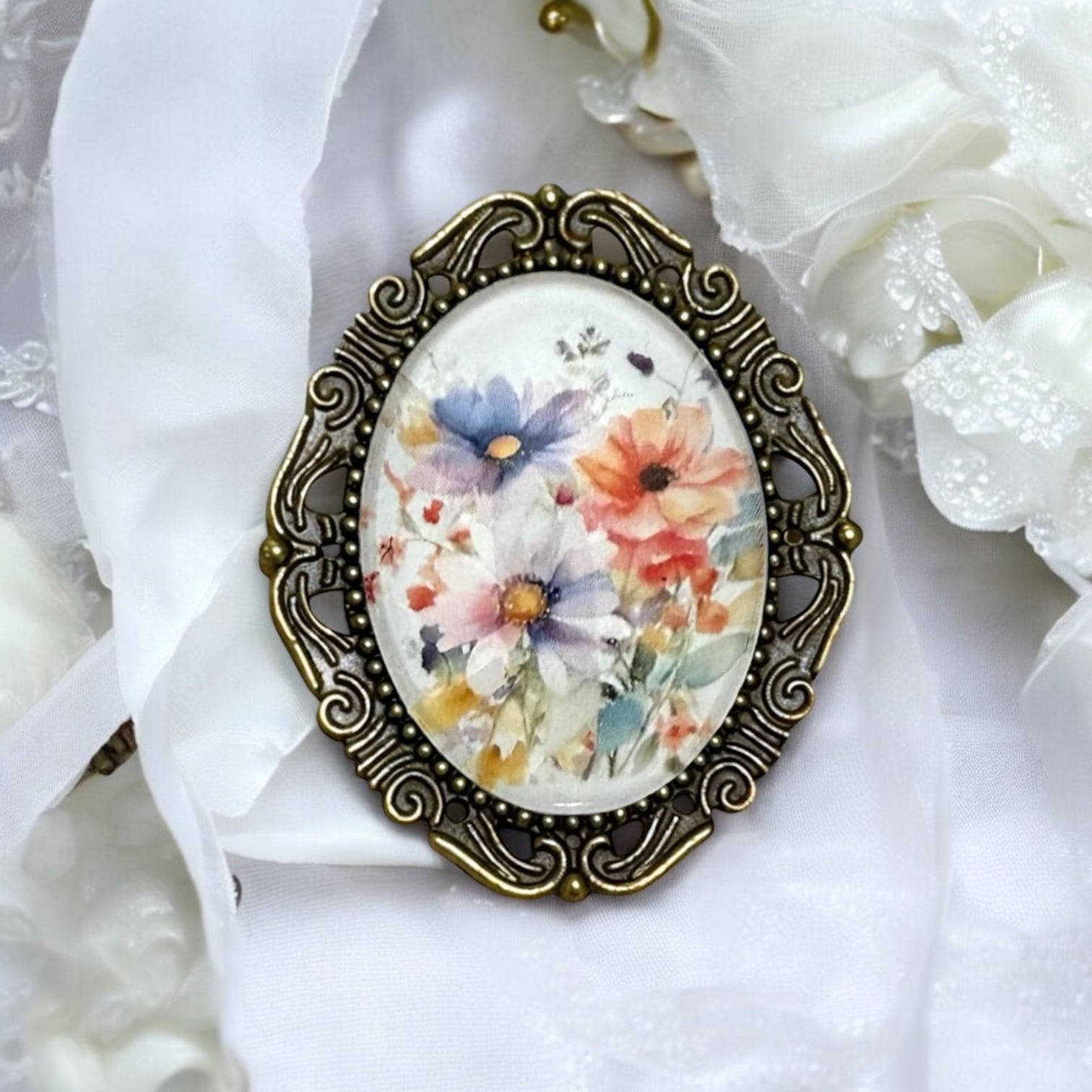 Wildflower brooch- pinks and oranges in an antiqued brass setting with silver pin back. PERFECT for Mother's Day cameo brooch for women, birthday gift with wildflowers, or a vintage brooch pin for yourself! The lovely picture is meticulously topped with a glass cover.
