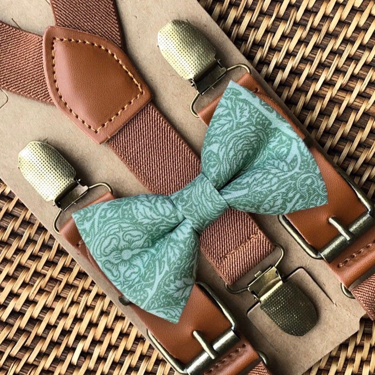 Elastic suspenders with vegan leather buckles matched with some of our best-selling bow ties to complete your outfit. Each set includes a suspender and bow tie. Our pre tied bow ties are PERFECT for groomsmen, ring bearer outfit, wedding, work suspenders, women's suspenders, leather suspenders or any other special occasion!