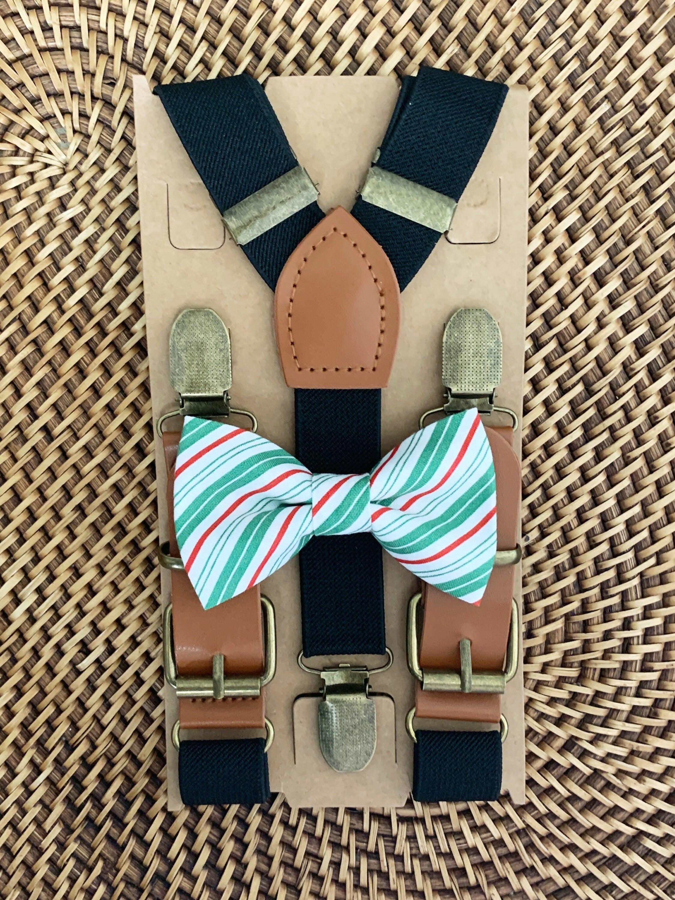 Christmas Candy-Striped Bow tie & Black Buckle Suspenders Set