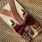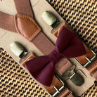 Make a bold style statement with our Cabernet Burgundy Bow Tie & Cognac Buckle Suspenders Set, the perfect wedding accessory for men, boys, groomsmen, and ring bearers. Handcrafted in the USA with premium fabrics and durable materials, this burgundy wedding bow tie and cognac suspenders set is designed for timeless elegance and long-lasting wear.