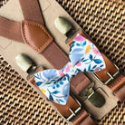 This floral bow tie & vegan leather brown suspenders set is a great choice for family photos, blue bow tie, groomsmen gift, weddings, ring bearer outfit, birthday celebration or any other special occasion.