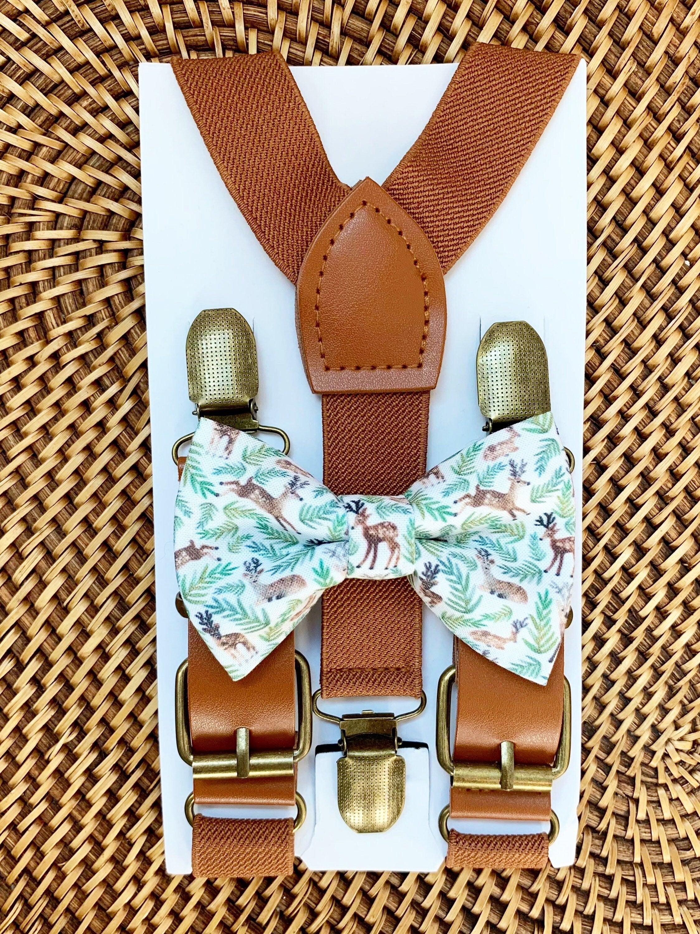 Whimsical reindeer bow tie and cognac buckle suspenders set for Christmas outfits, holiday family photos, winter weddings, Christmas parties, school concerts, and festive ring bearer attire. This pre-tied whimsical reindeer bow tie with adjustable cognac buckle suspenders is a charming and stylish holiday accessory set for boys and men, perfect for creating coordinated Christmas looks with classic seasonal character.