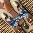 Upgrade your wedding style with this slate blue floral bow tie and suspenders set – a timeless, elegant choice that photographs beautifully and completes any formal look.