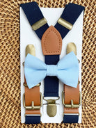 Sky Blue Bow Tie & Navy Buckle Suspenders Set