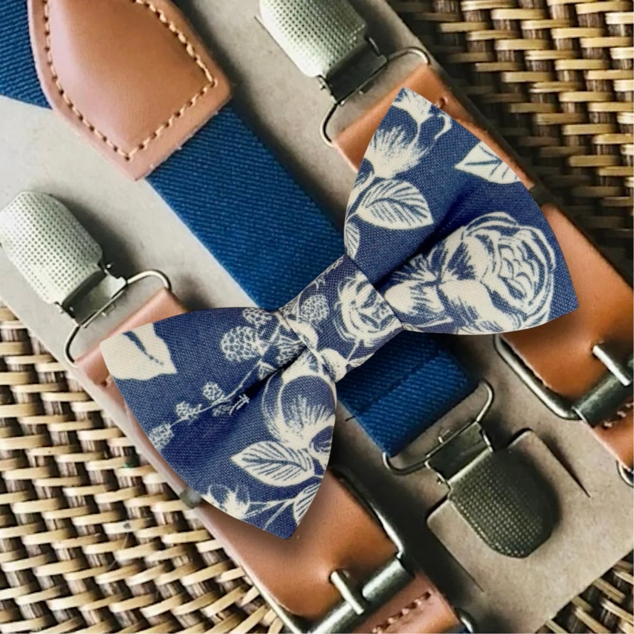 Vintage Steel Blue Bow Tie & Navy Suspenders: Your special guy will look so handsome when he shows up wearing this vintage steel blue bow tie and navy blue suspenders! This floral bow tie & suspender set is a great choice for family photos, wedding, ring bearer outfit for a wedding, birthday celebration or any other special occasion.