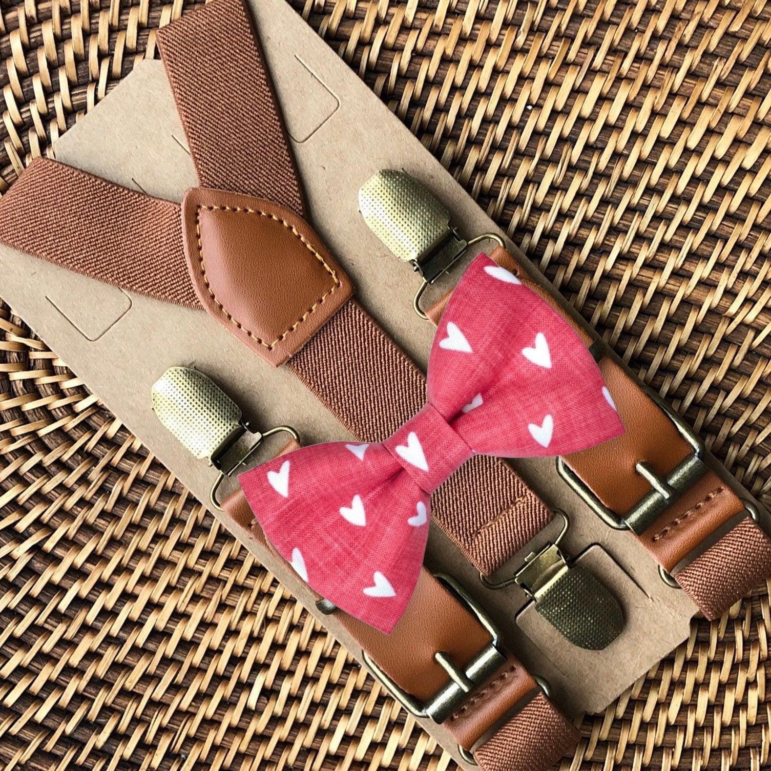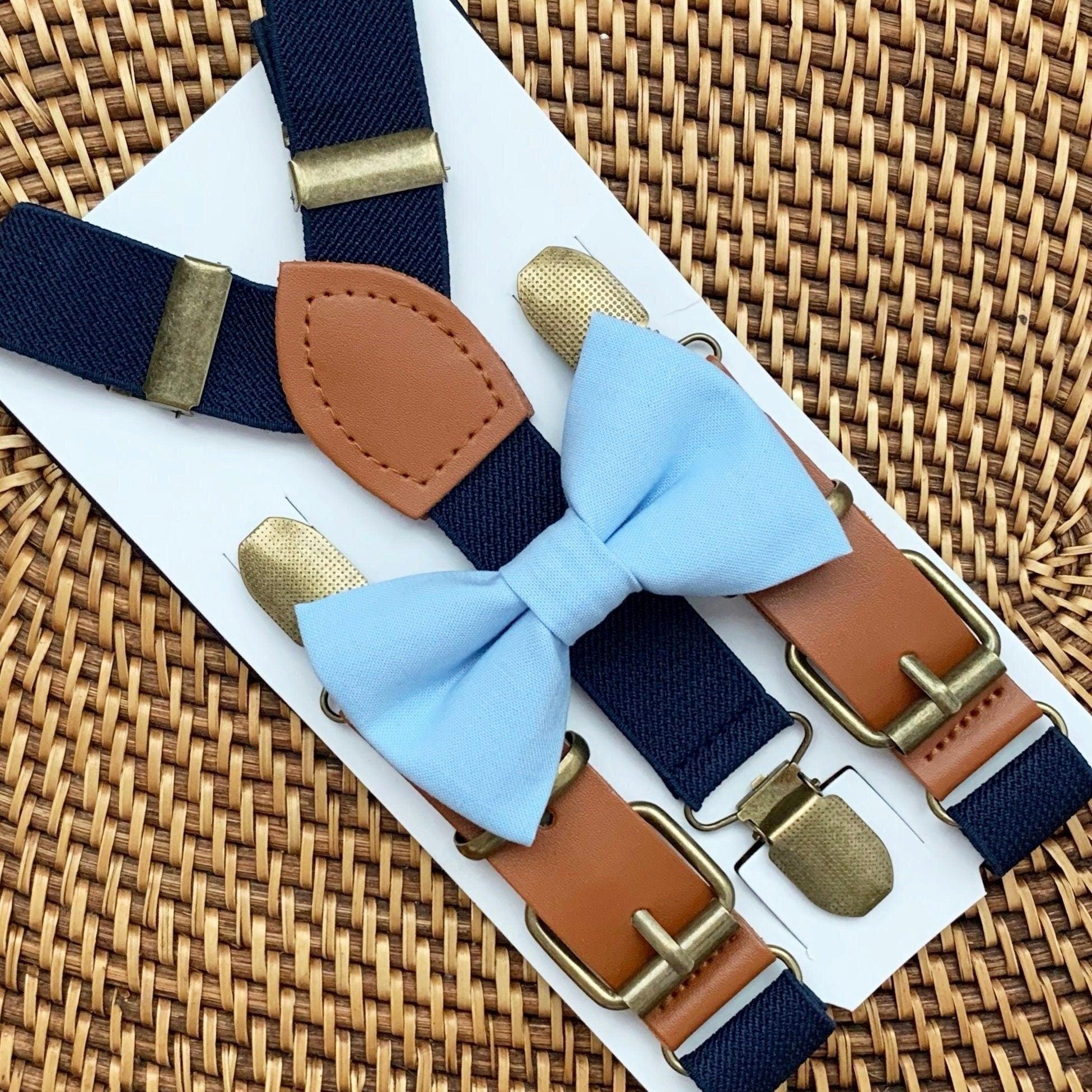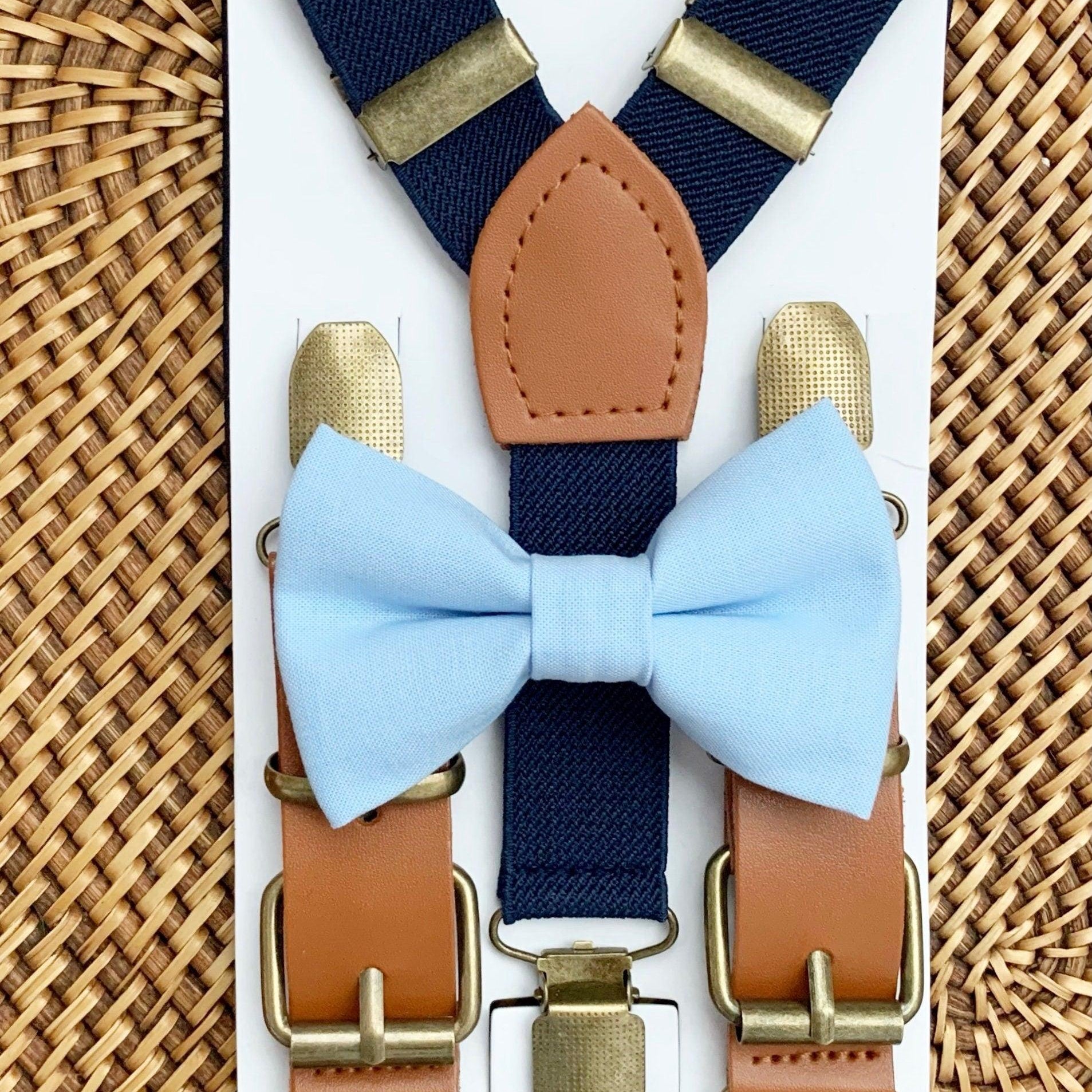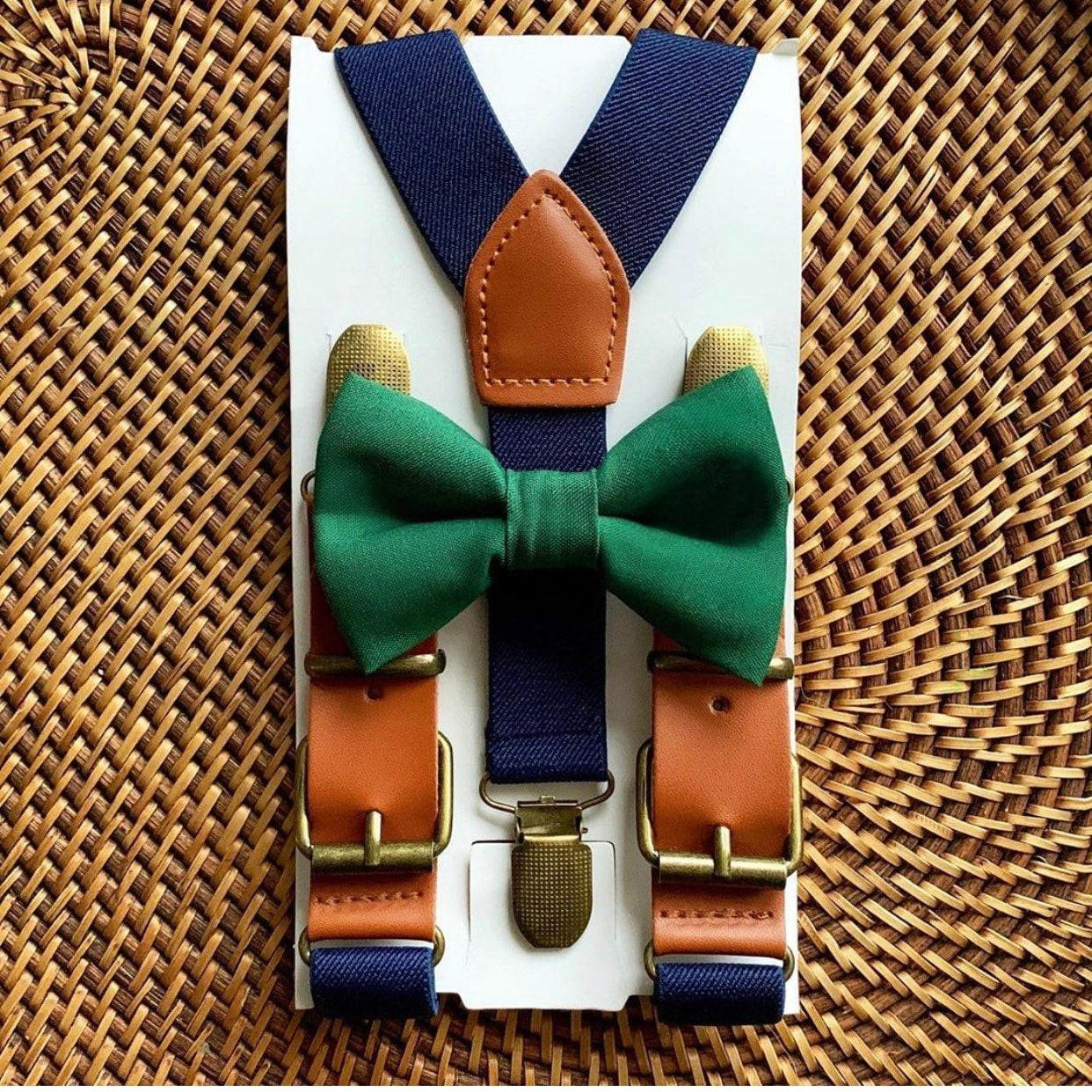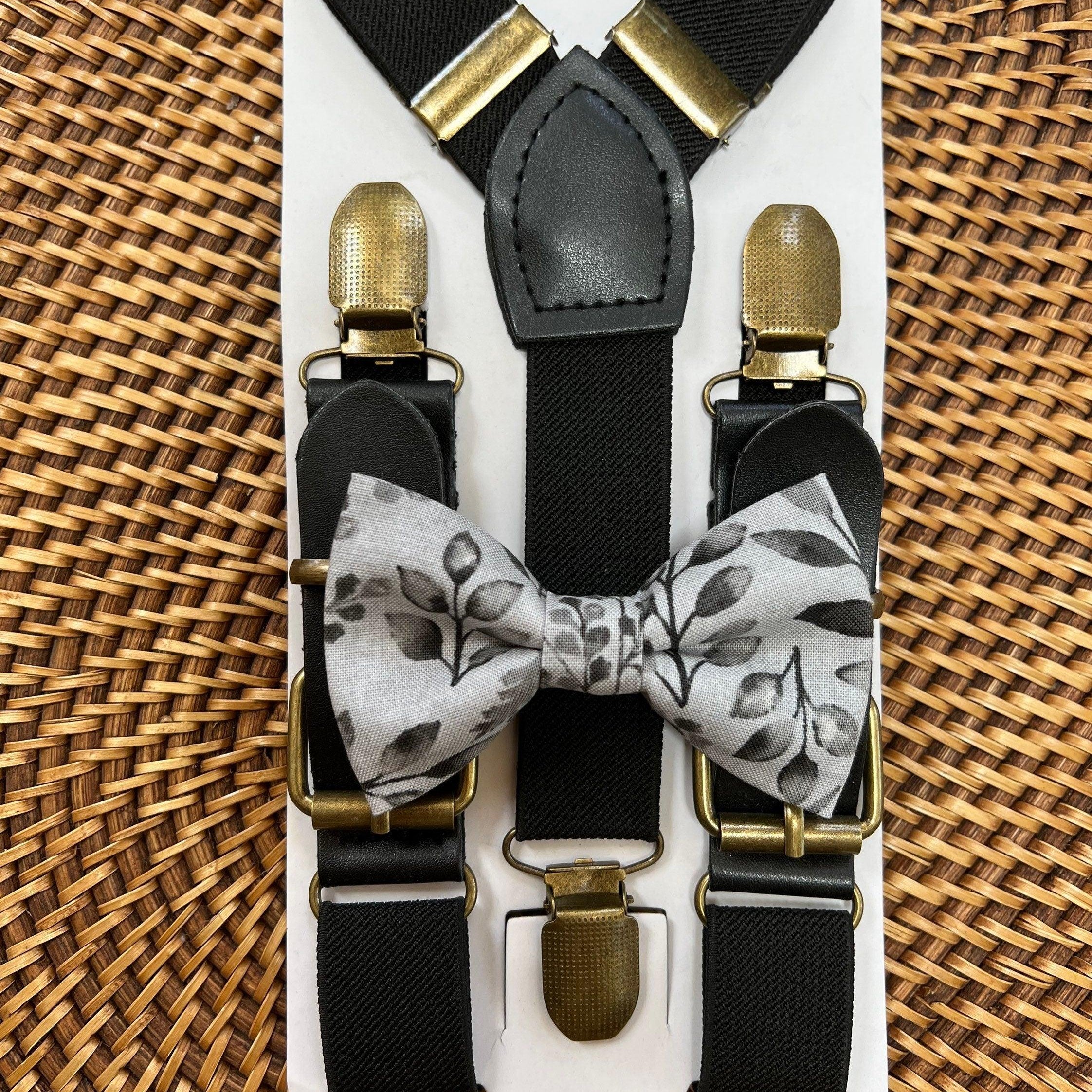 Elastic suspenders with vegan leather buckles matched with some of our best-selling bow ties to complete your outfit. Each set includes a suspender and bow tie. Our pre tied bow ties are PERFECT for groomsmen, ring bearer outfit, wedding, work suspenders, women's suspenders, leather suspenders or any other special occasion!