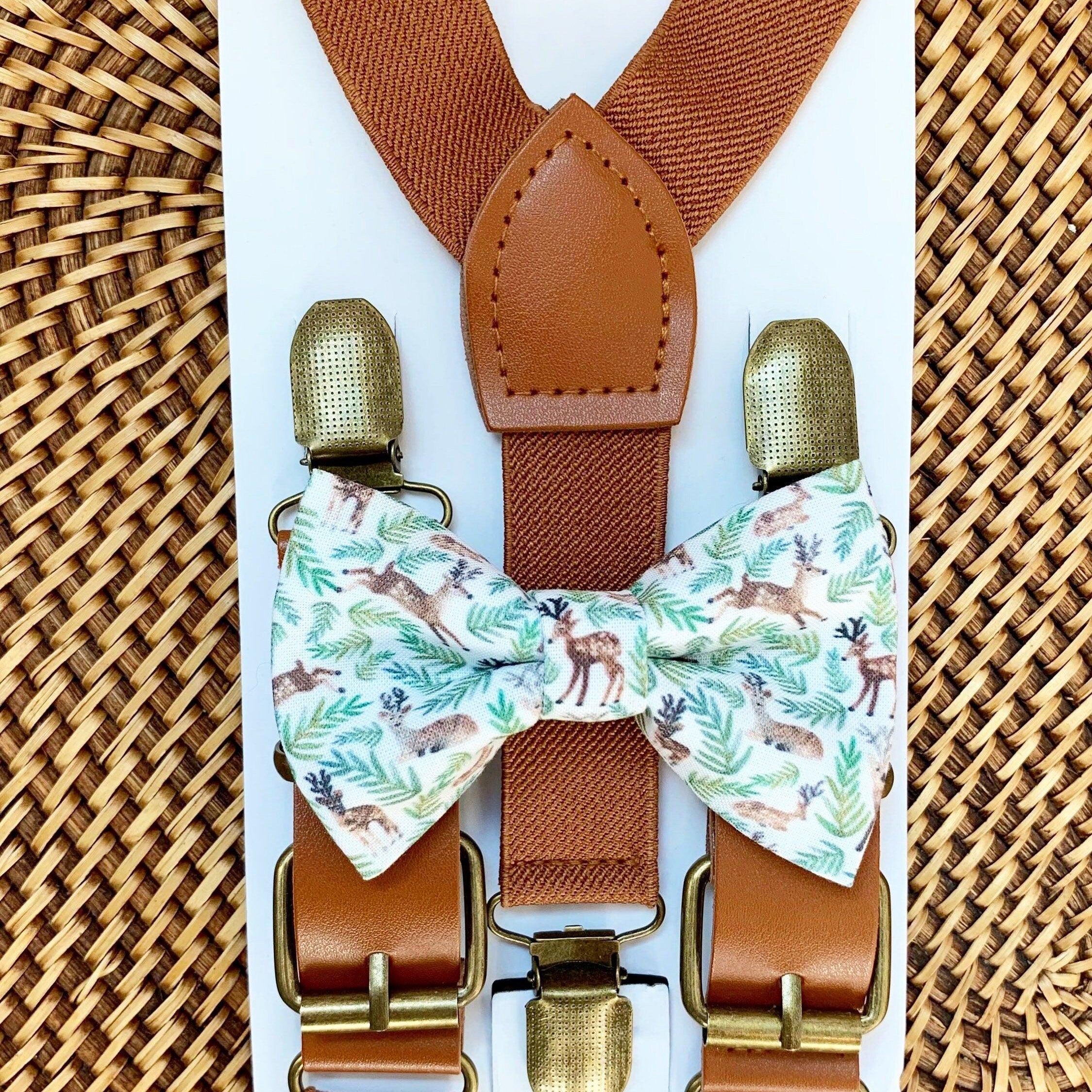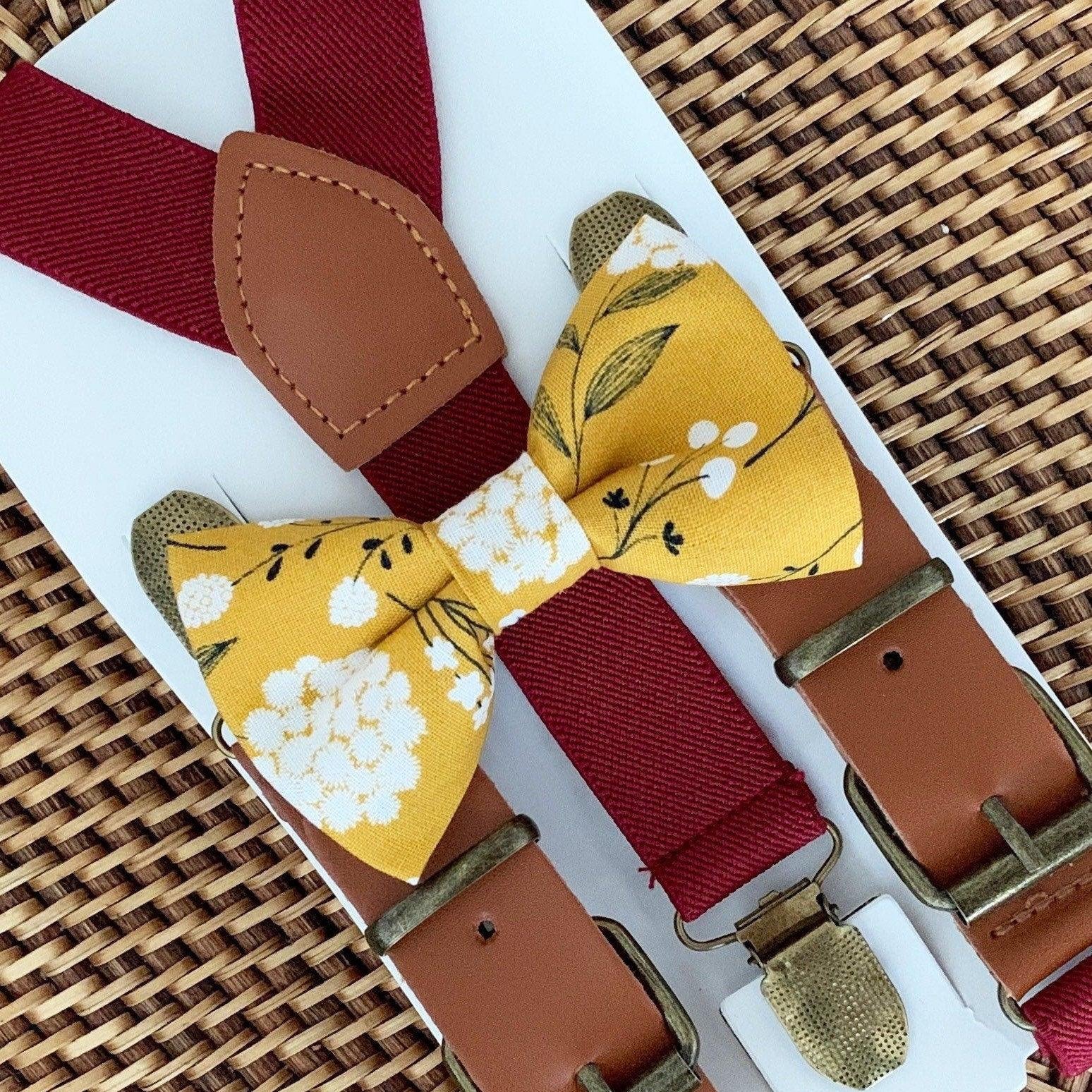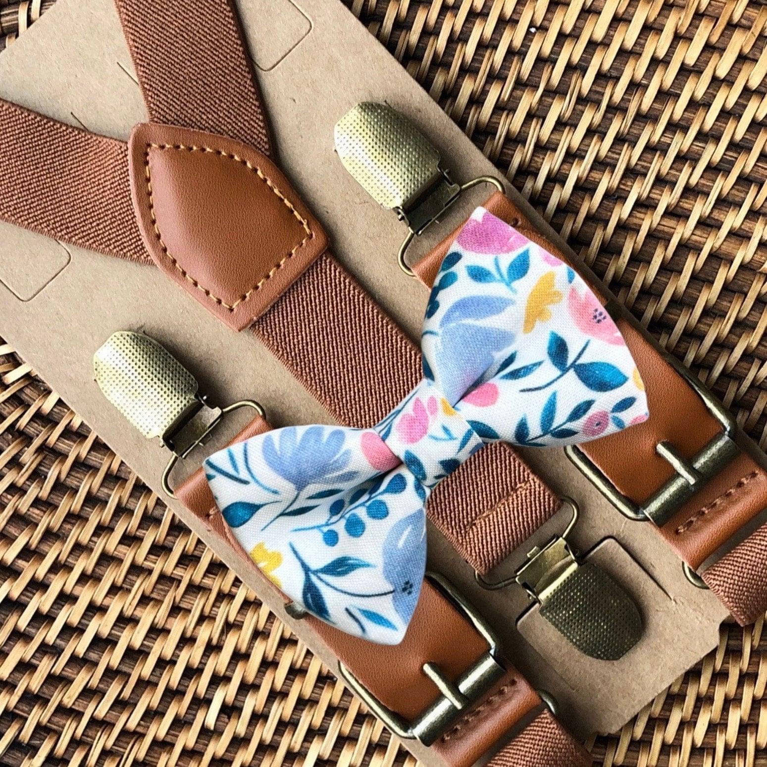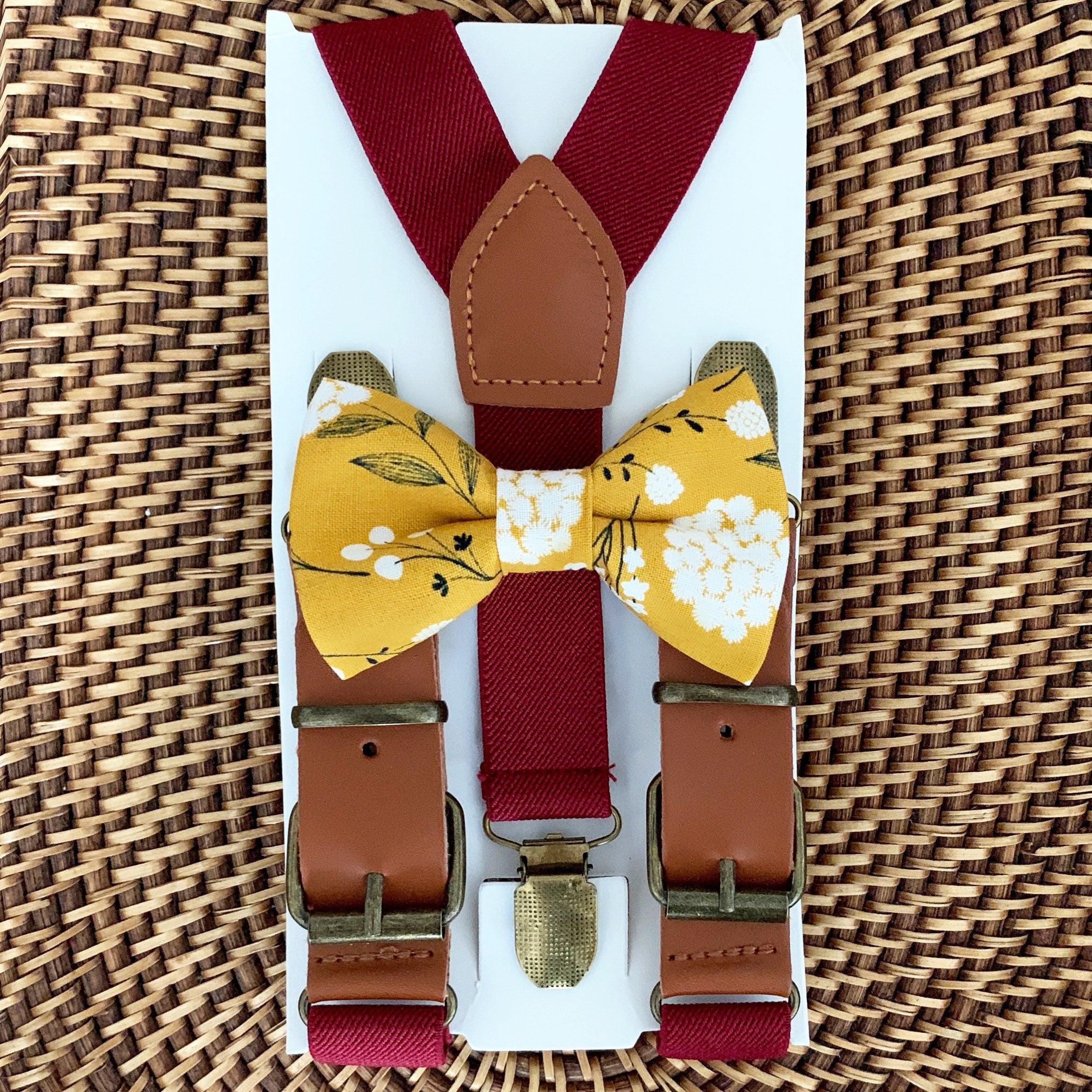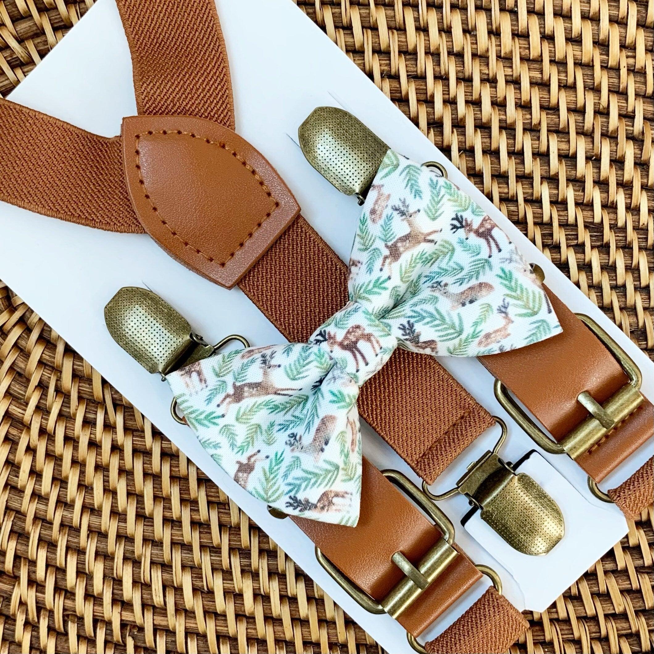 Elastic suspenders with vegan leather buckles matched with some of our best-selling bow ties to complete your outfit. Each set includes a suspender and bow tie. Our pre tied bow ties are PERFECT for groomsmen, ring bearer outfit, wedding, work suspenders, women's suspenders, leather suspenders or any other special occasion!